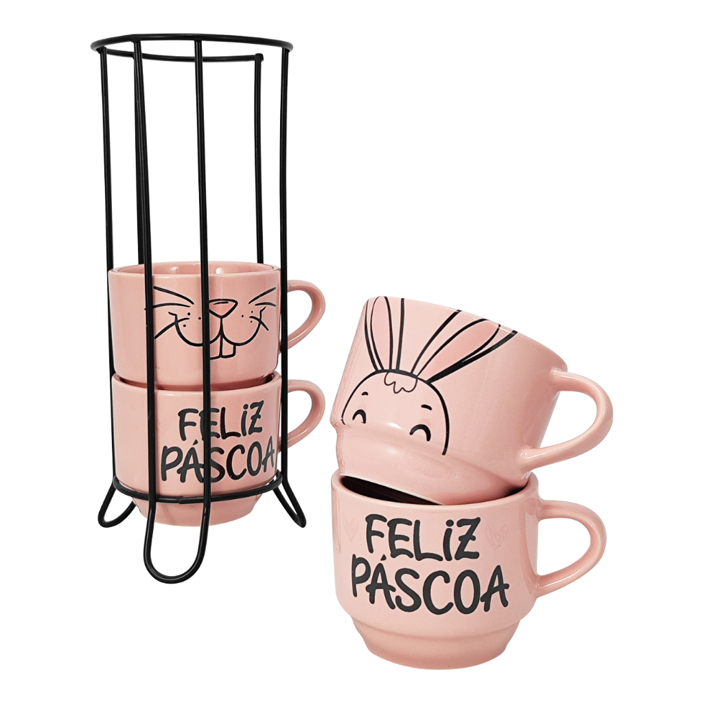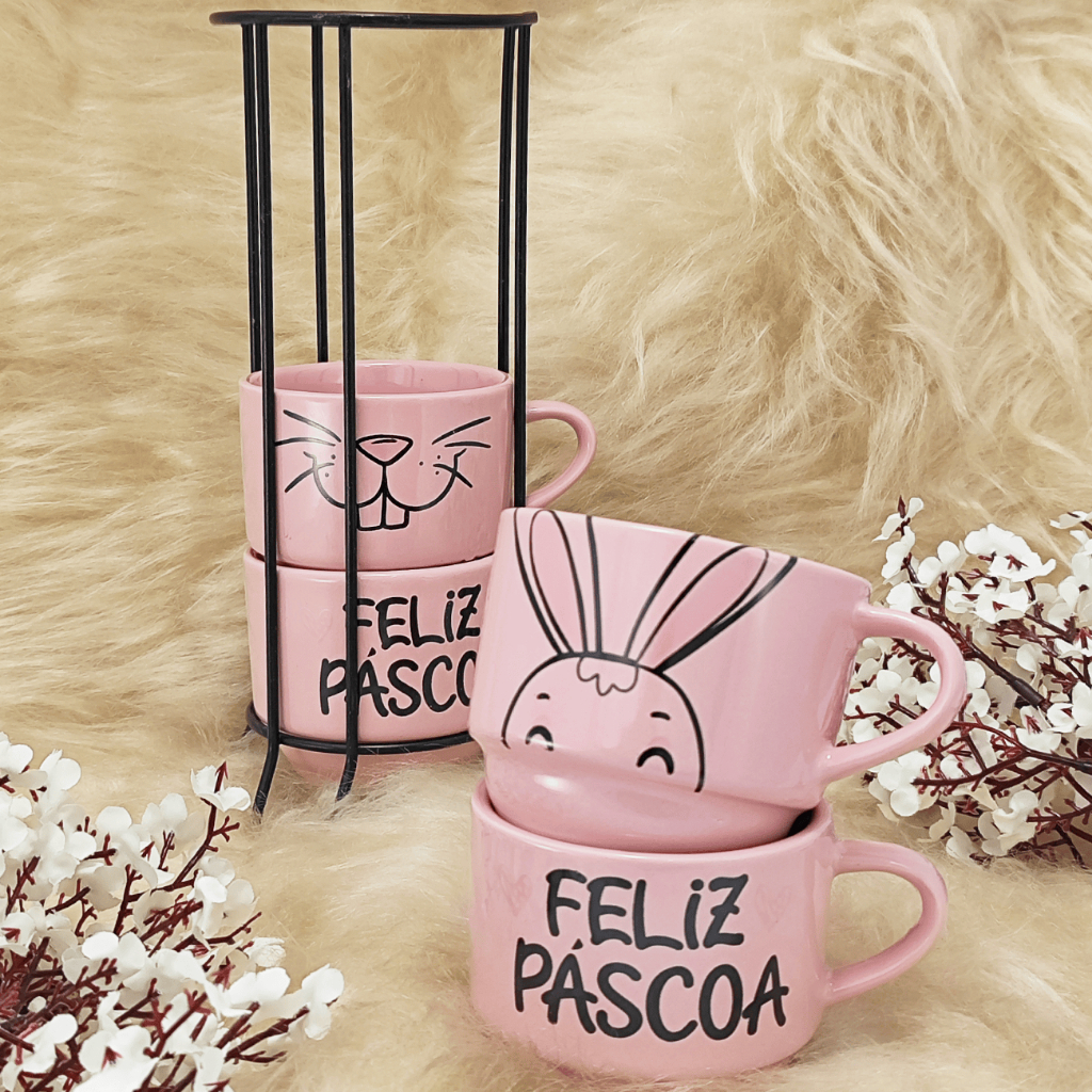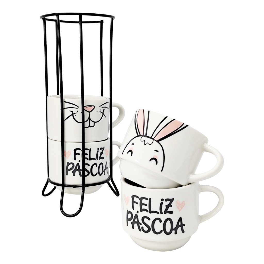 Kit 4 Xícaras Porcelana 210ml Páscoa com variação cor + Suporte
