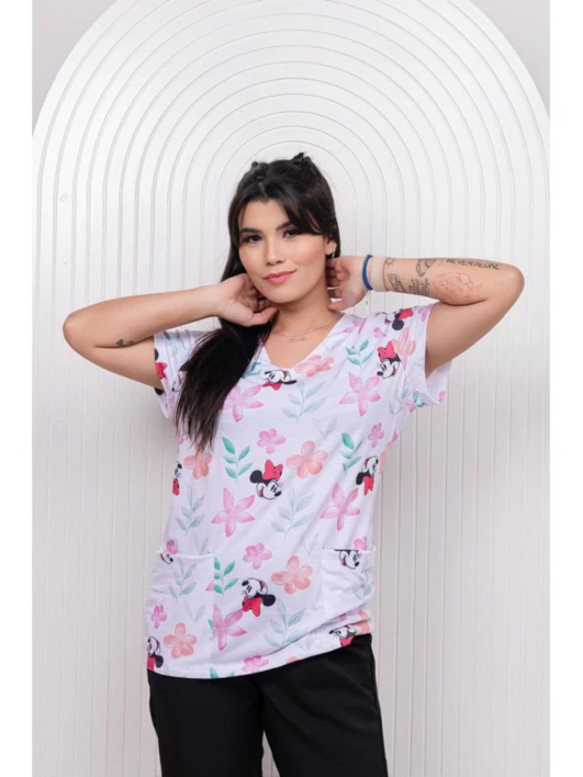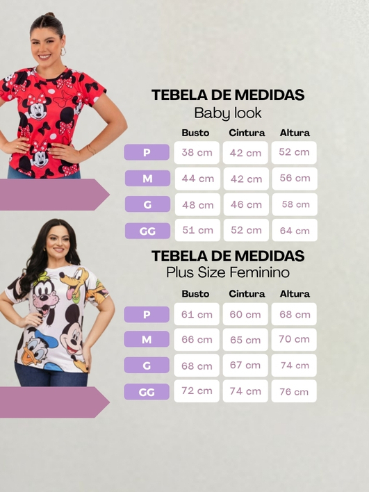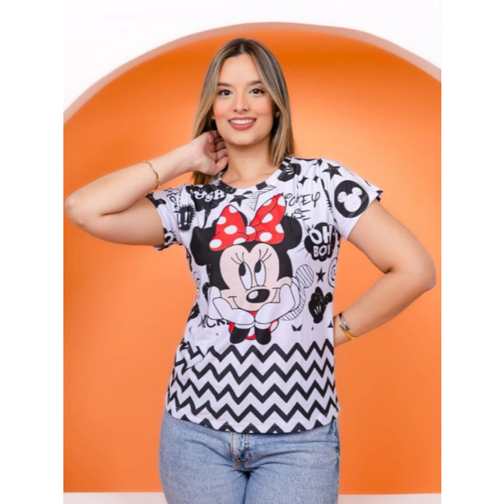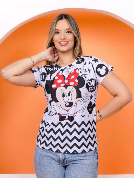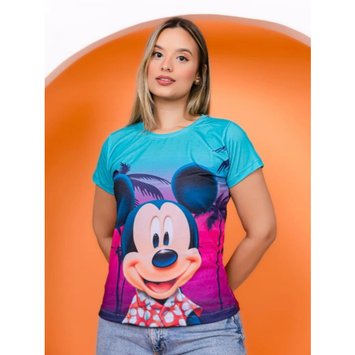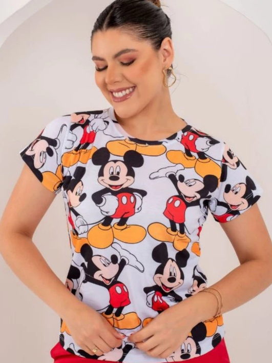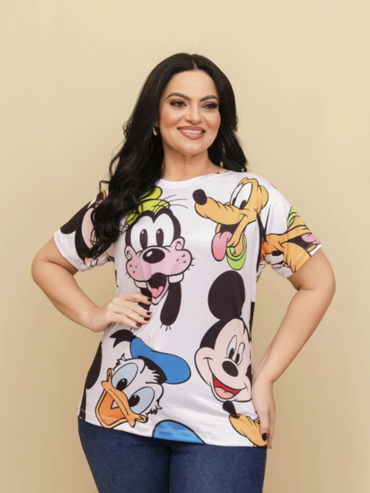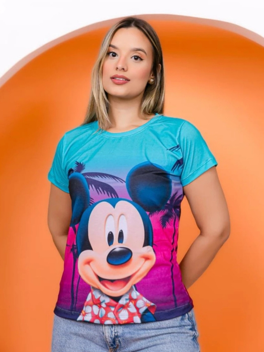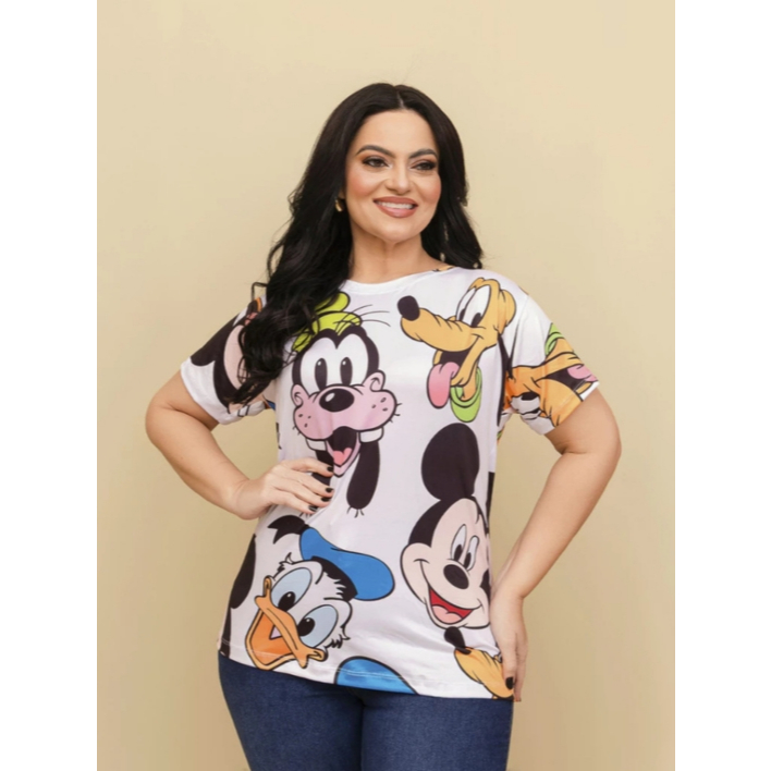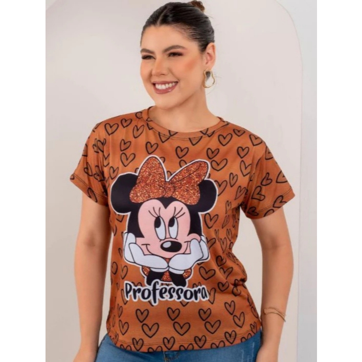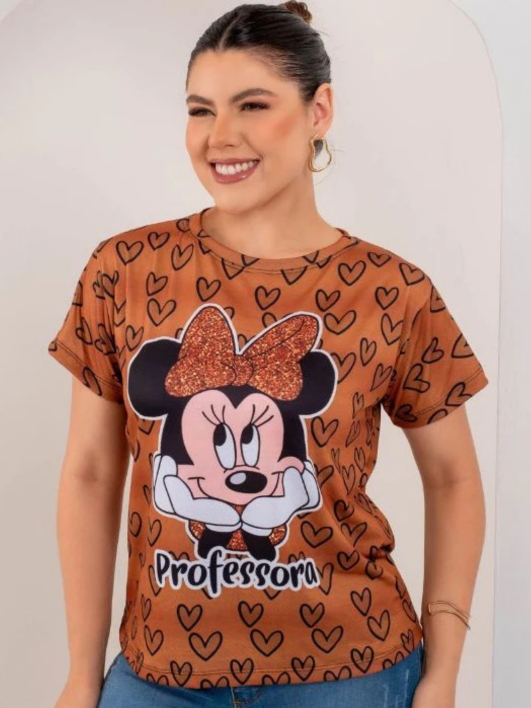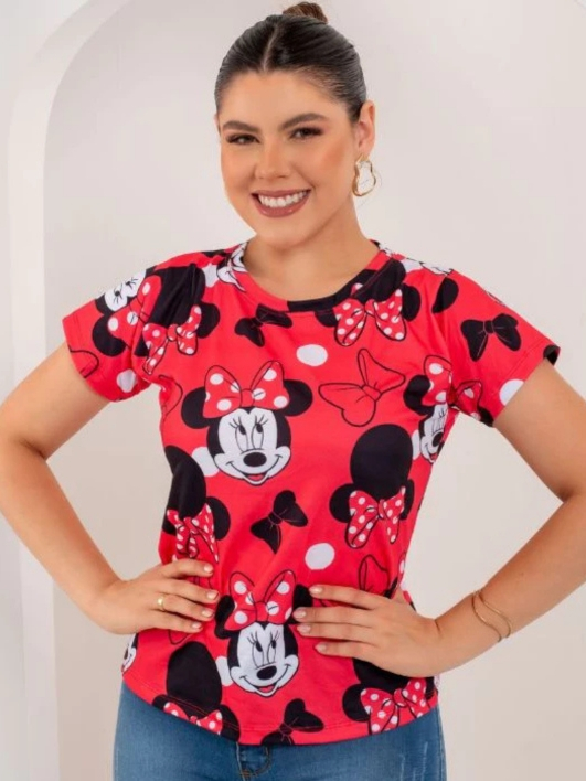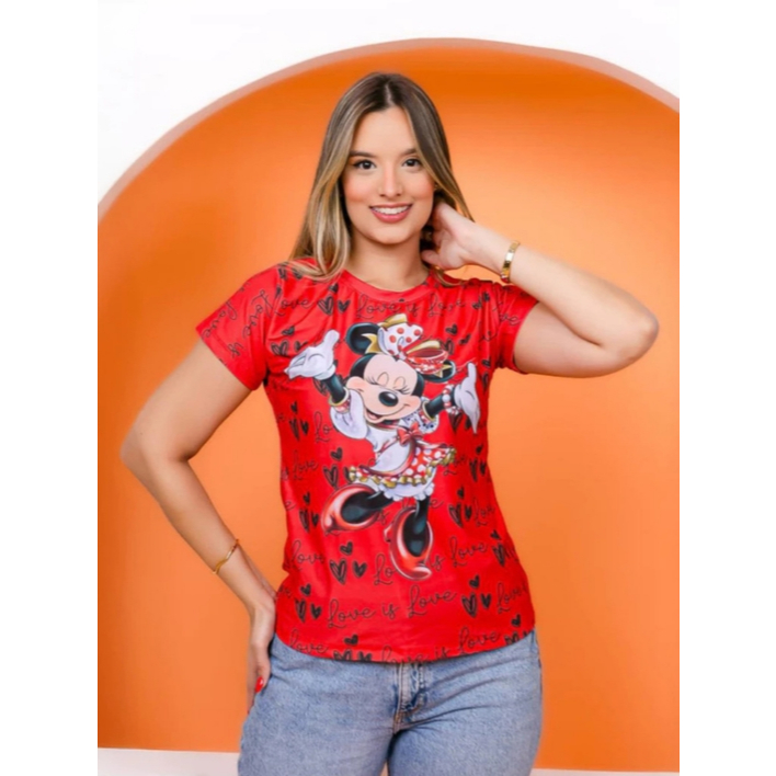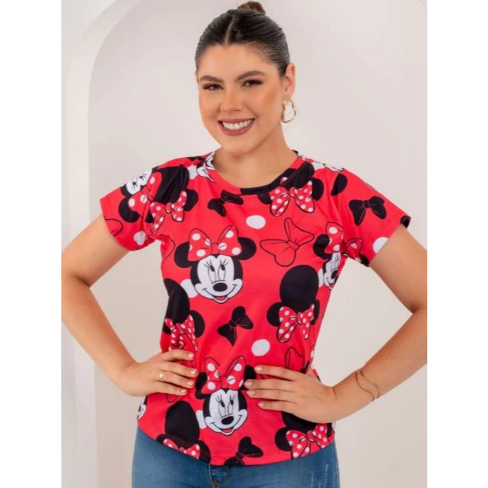 T-shirt Feminina Estampada Mickey Minnie Malha Soft Baby Look Plus Size