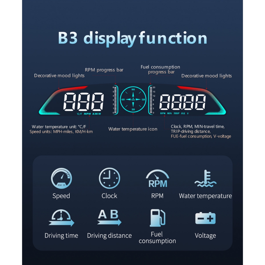 Universal OBD2 Medidor Velocímetro Head Up Display Muti-Função B3 HUD Temperatura Da Água Turbo RPM Acessórios Do Carro