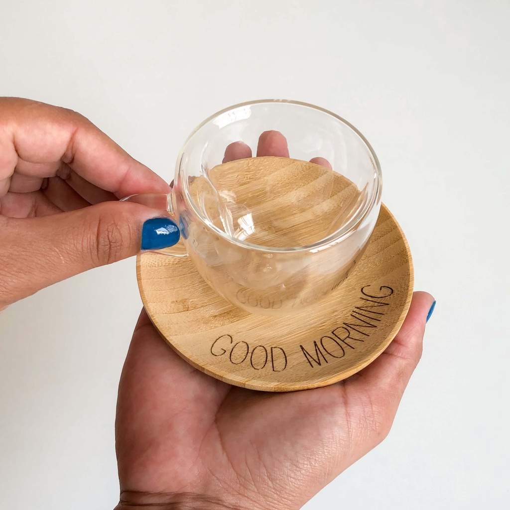 Jogo 2 Xícaras de Café 80ml com Pires de Bambu Personalizado