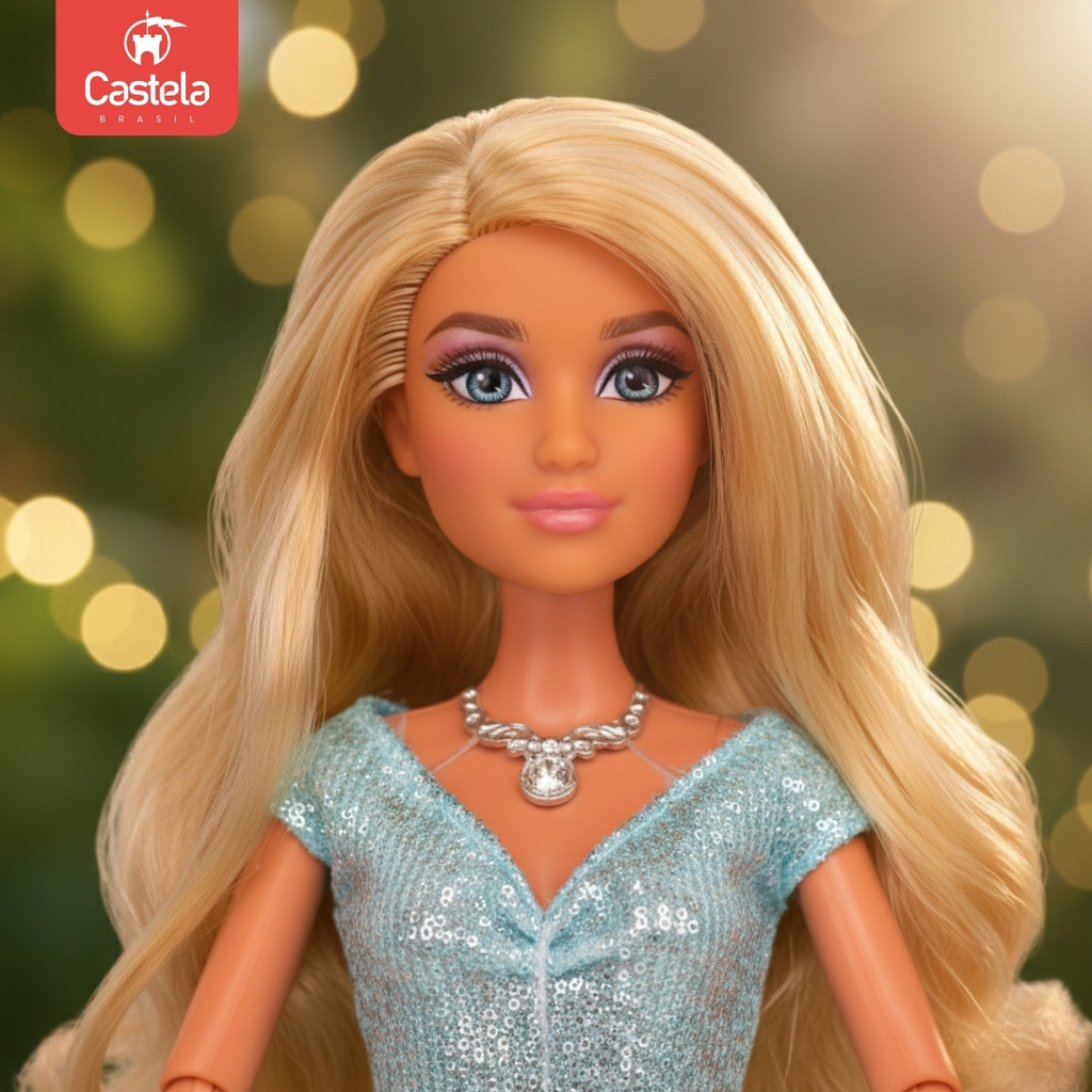 Boneca Princesa Fashion Vestido Azul Brilhante Style Acessórios Castela
