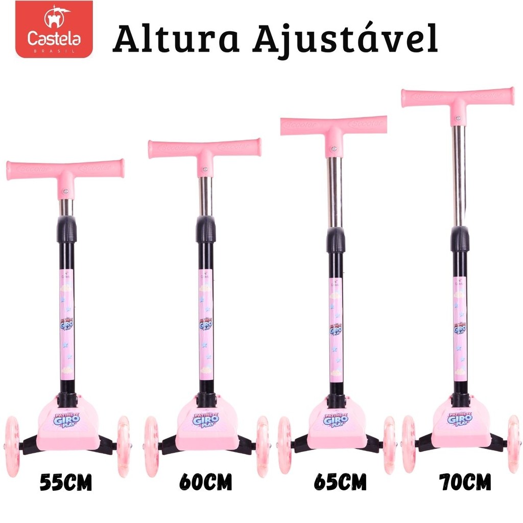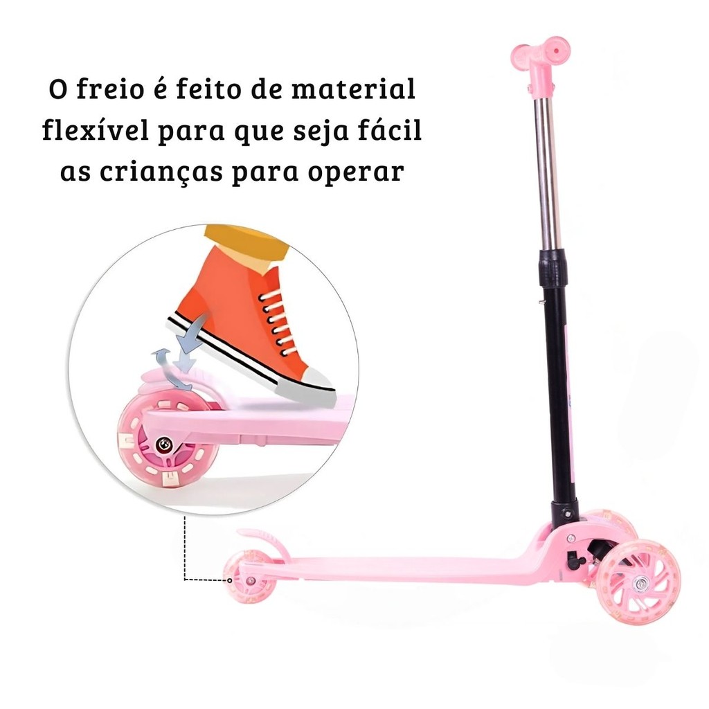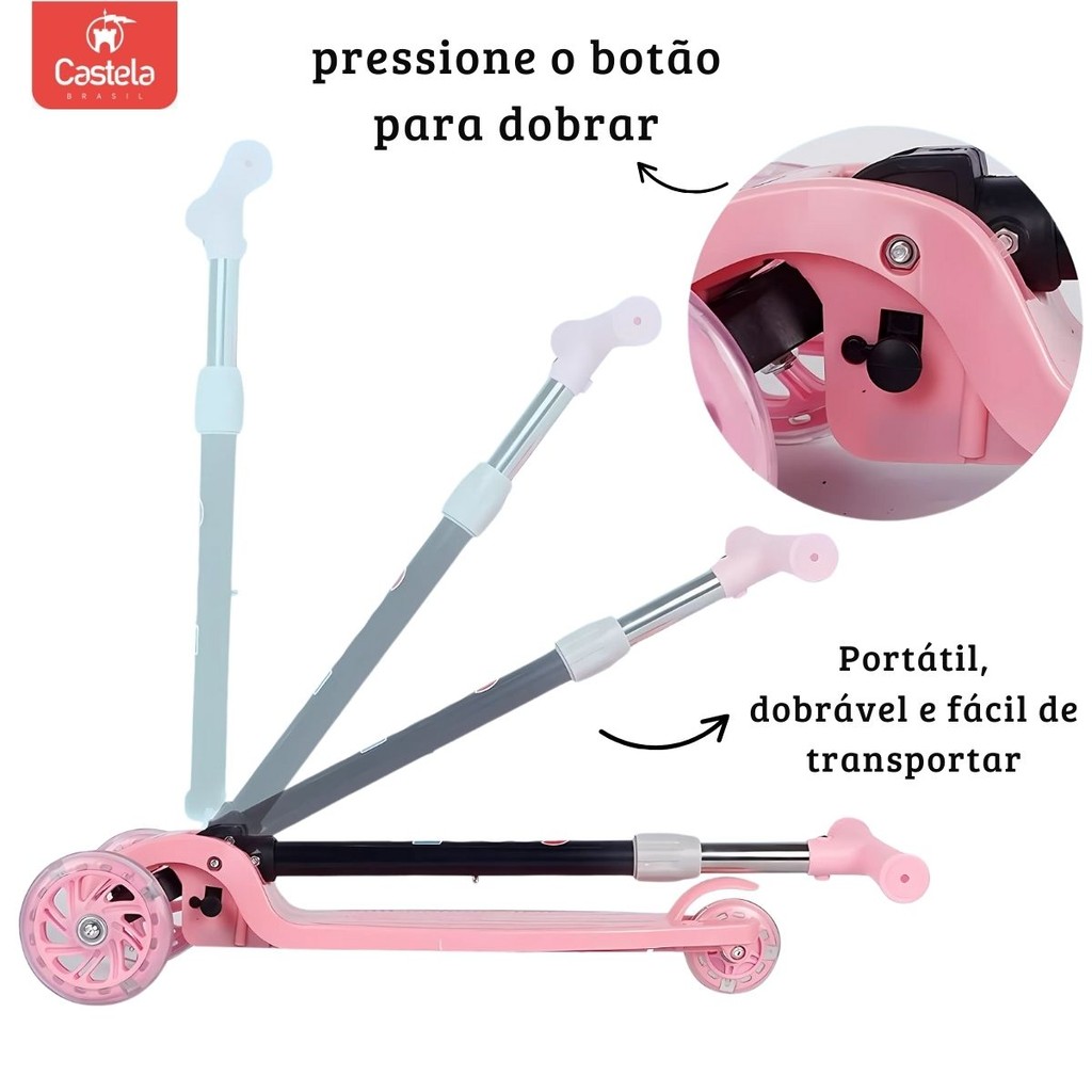 Patinete Dobrável Rosa Infantil 3 Rodas Com Led - Castela