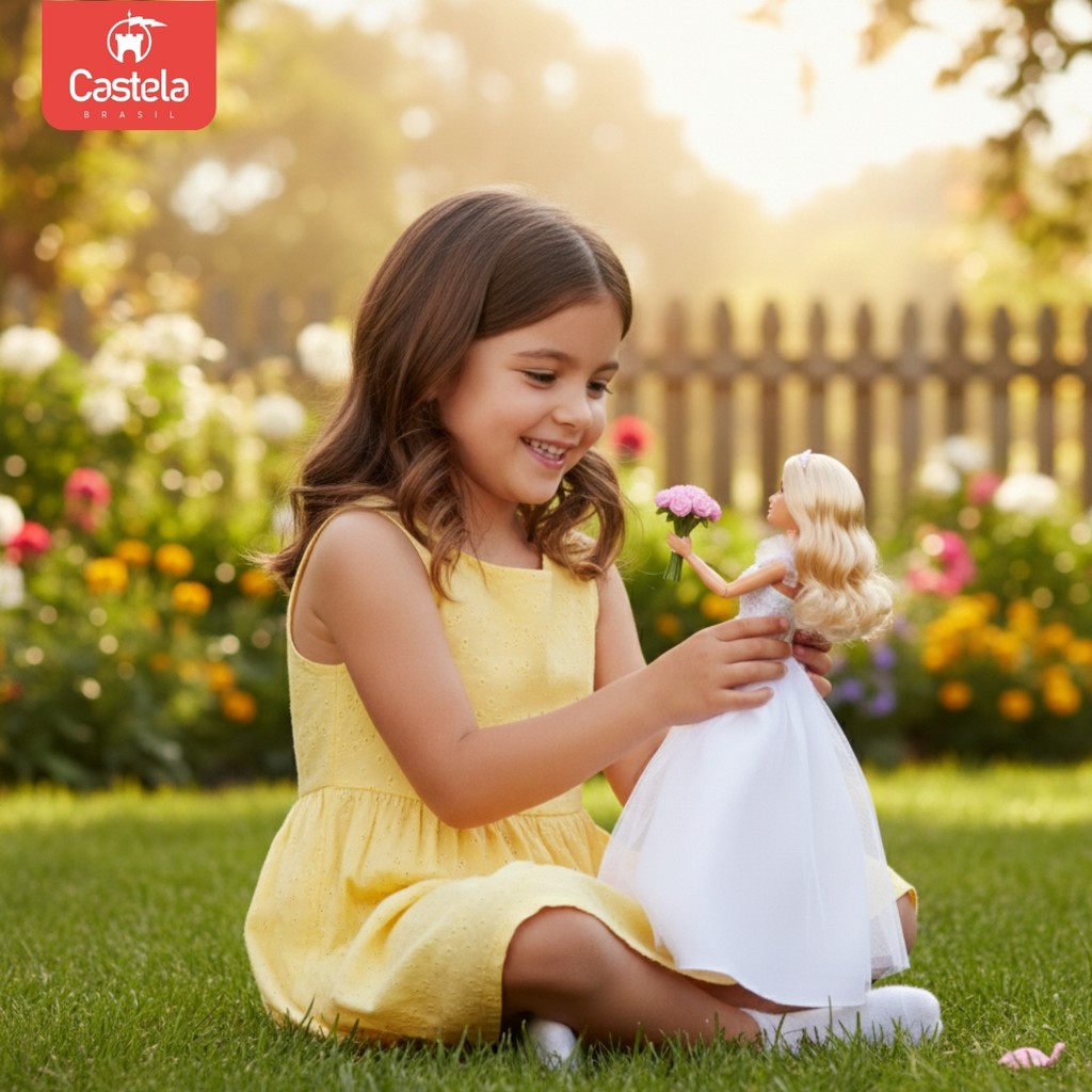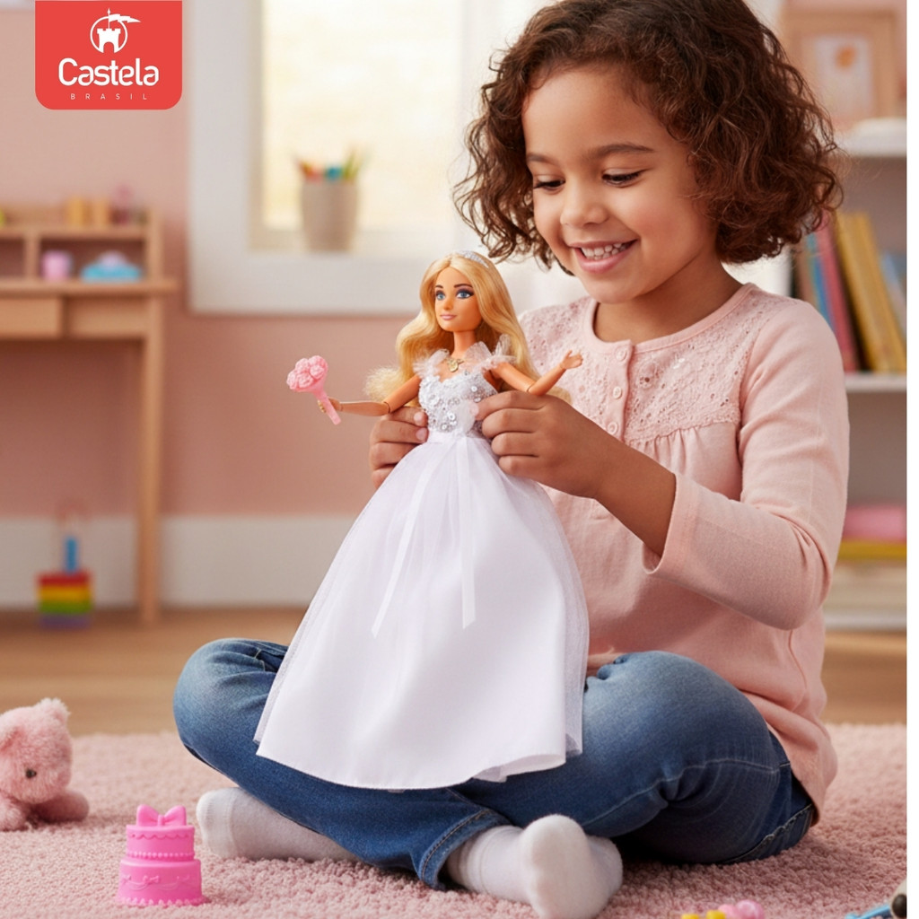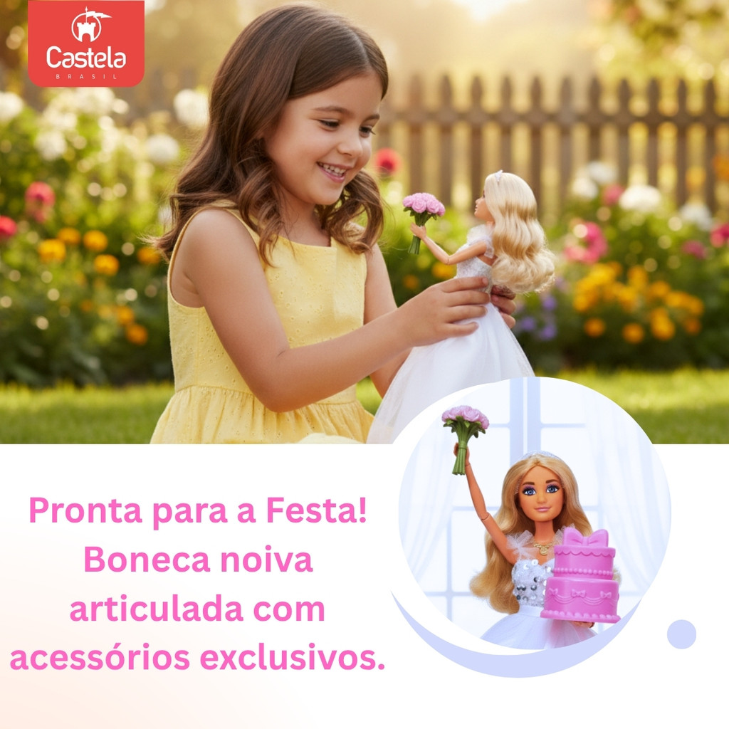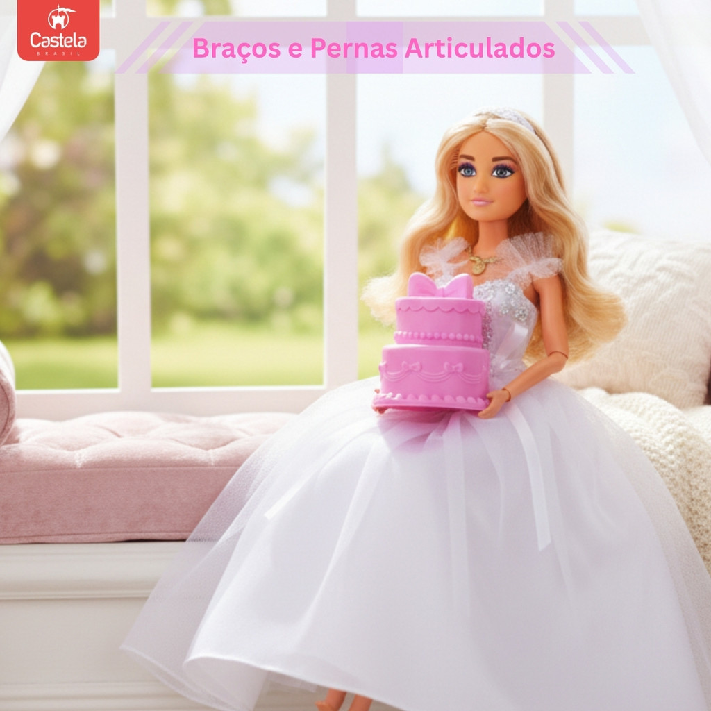 Boneca Coleção Vestido De Noiva Acessórios Buquê Flor Bolo - Castela