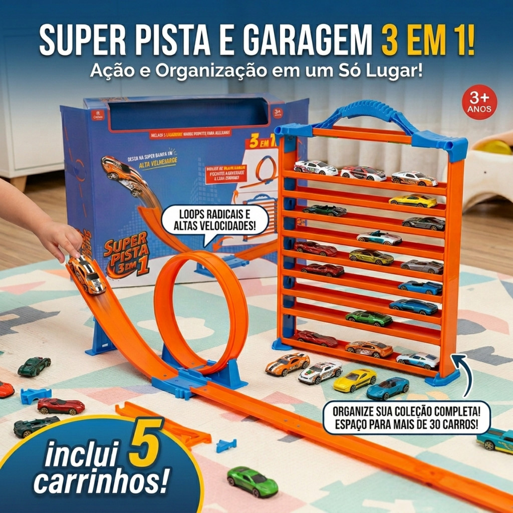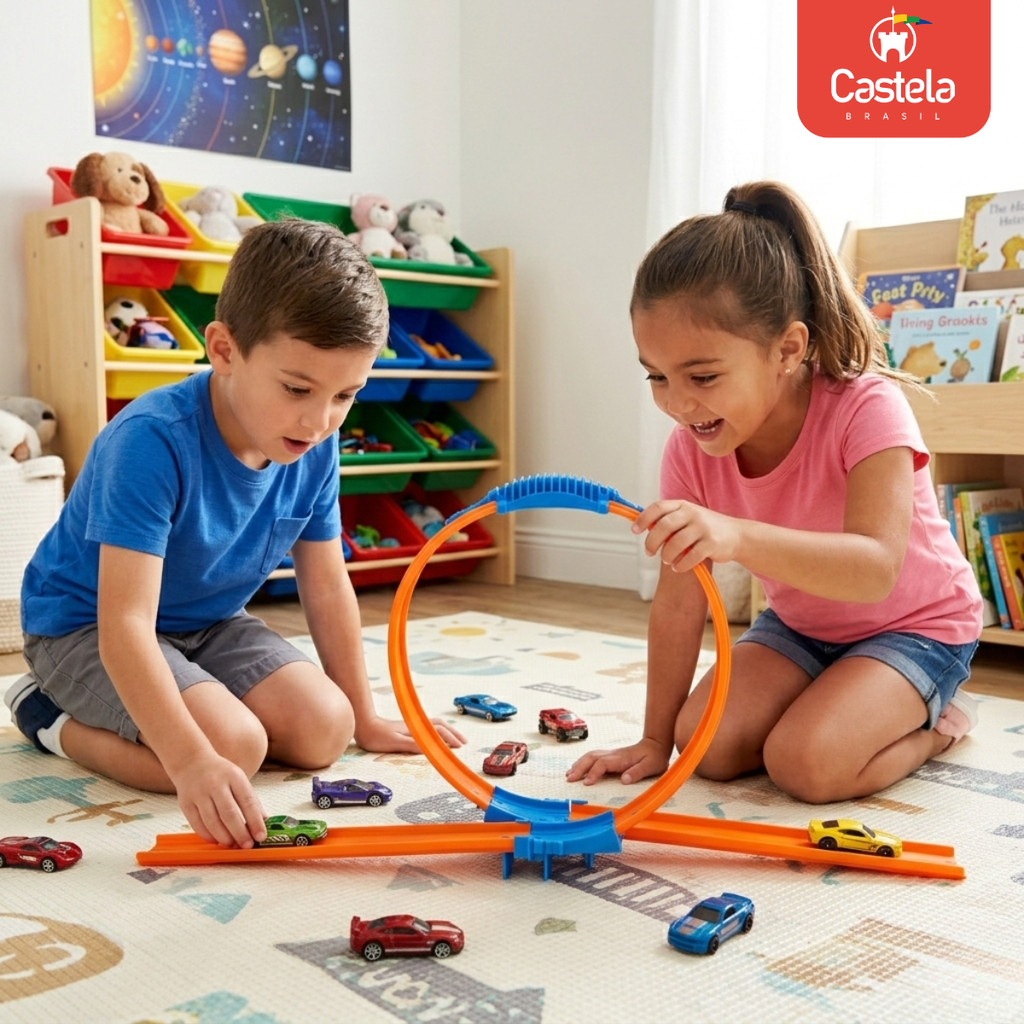 Super Pista 3 Em 1 Looping Rampa e Expositor Com 5 Carrinhos Coloridos - Castela