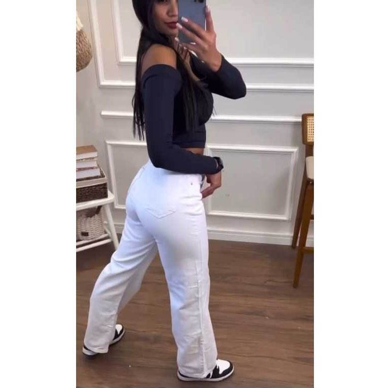 Calça Jeans Pantalona Wide Leg Branca Feminina Envio Imediato