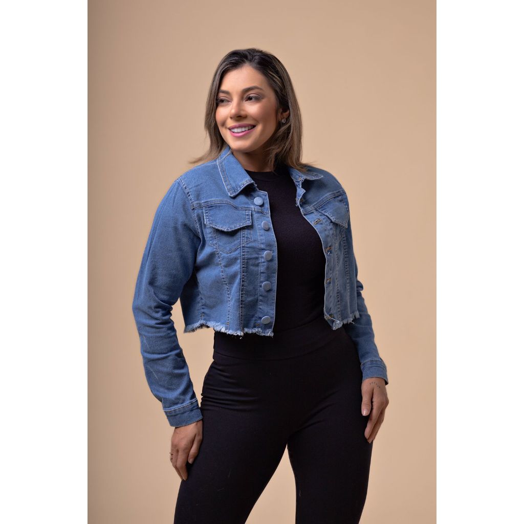 Jaqueta Cropped Jeans Feminina Botão Encapado