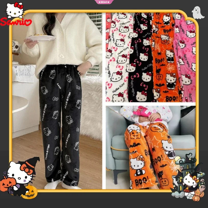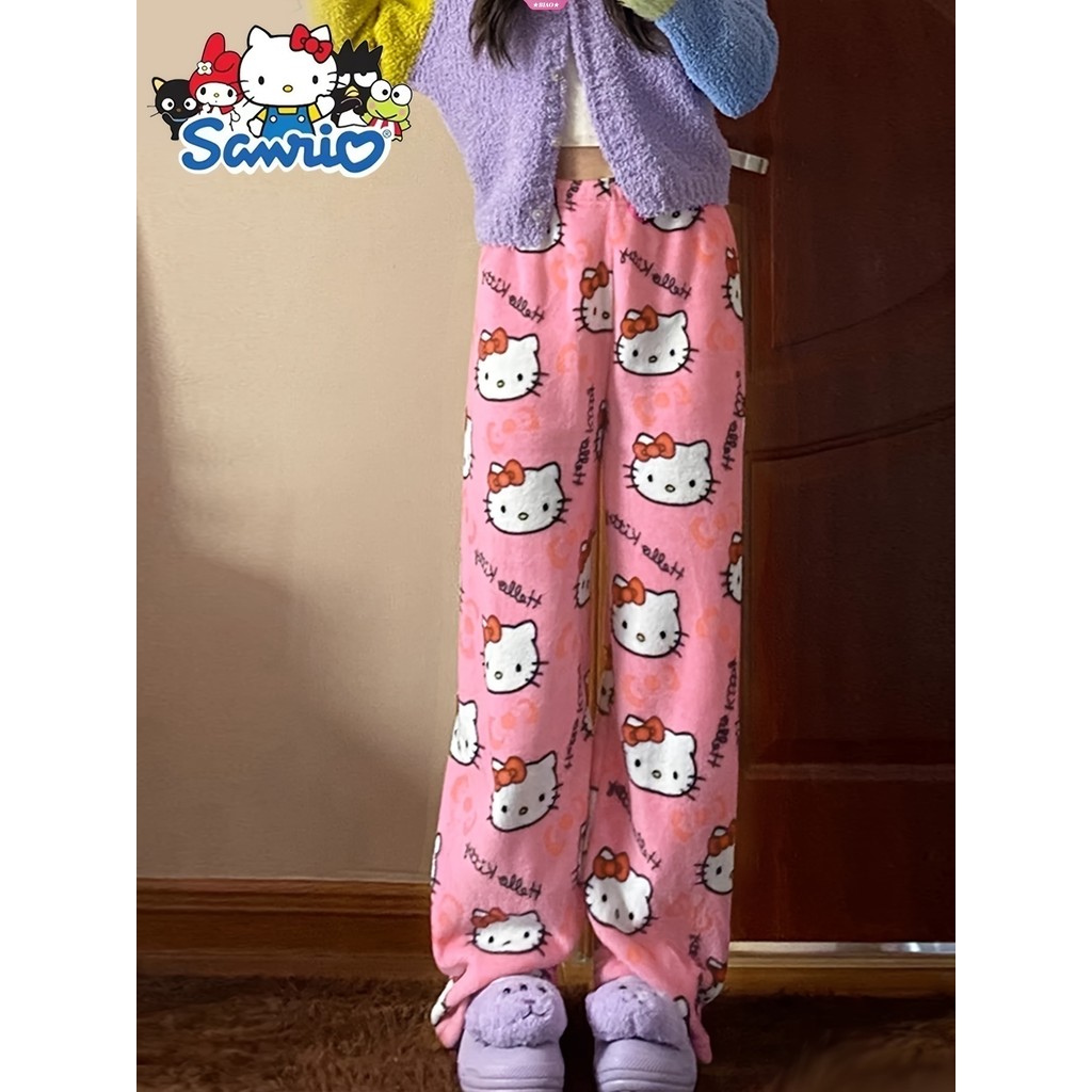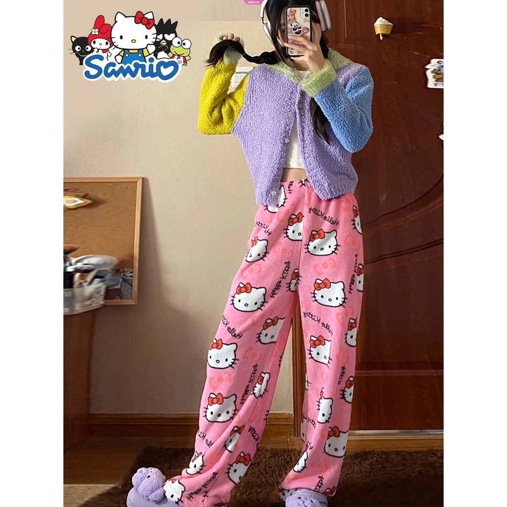 Calça De Pijama Hello Kitty Sanrio Anime Fleece Tecido Elástico Duplo Calças Macias Femininas De Desenho Animado