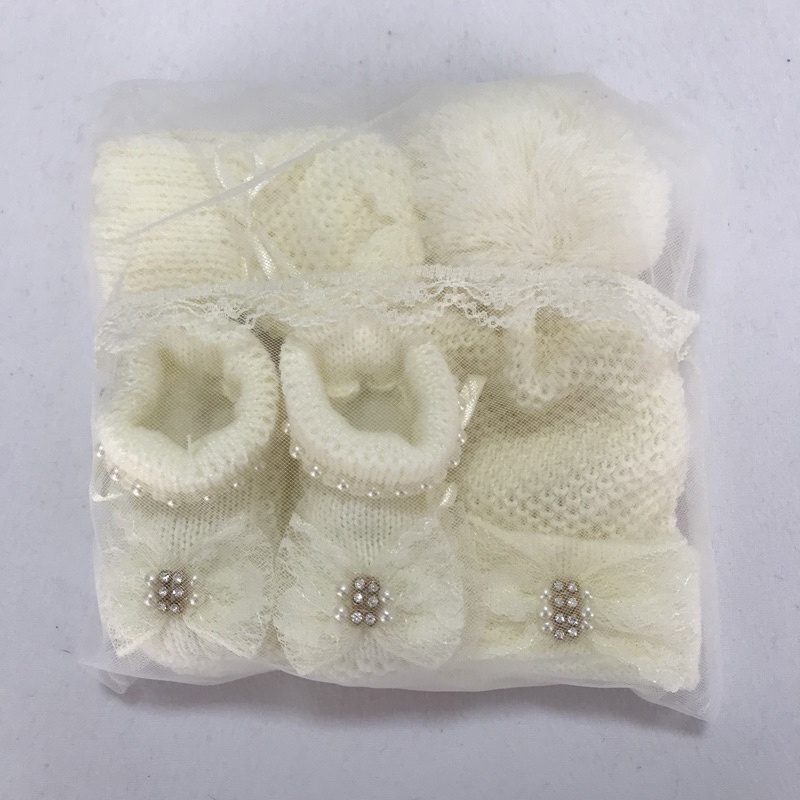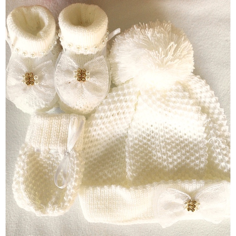 Kit Touca/ Gorro, Luvas E Botinha Sapatinho Em Tricô Linho Bebê