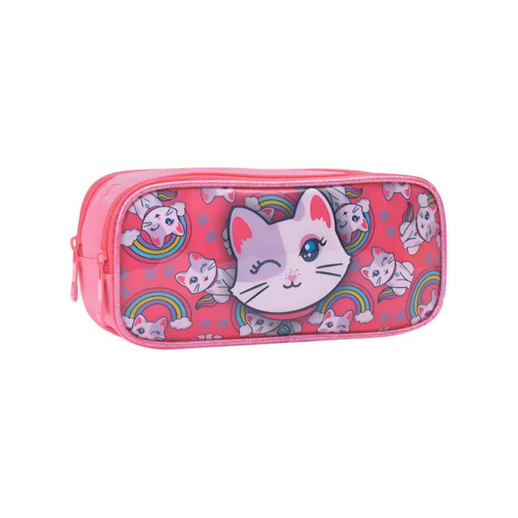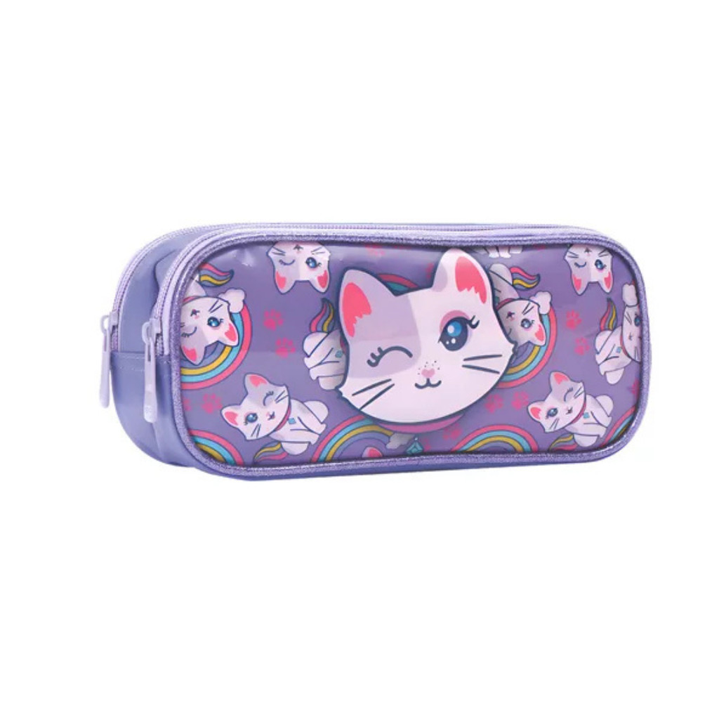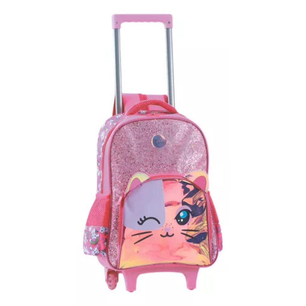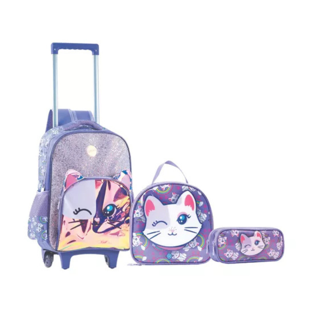 Kit Mochila Escolar Rodinha Gatinha Rosa Roxo Meninas Lancheira Termica Estojo