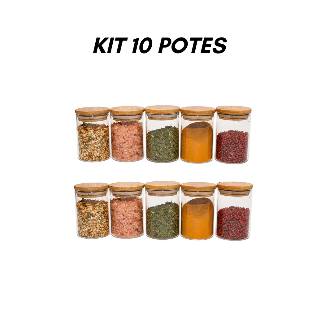 Kit 10 Potes De Vidro Condimentos 250ml Com Tampa De Bambu