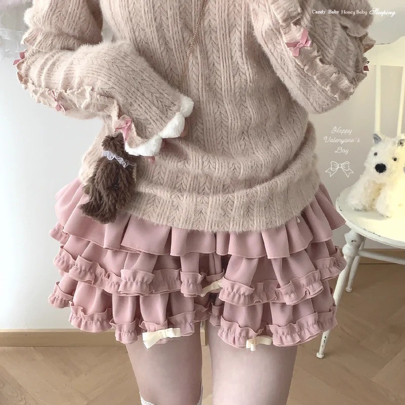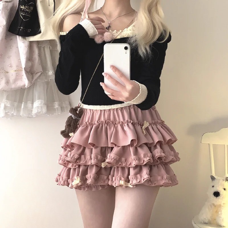 Y2K Doce Babados Cintura Alta Mini Saia Feminina Japonesa Fofa Lolita Arco Uma Linha Bolo