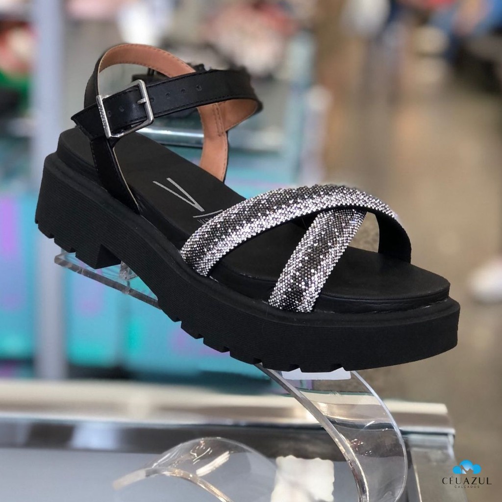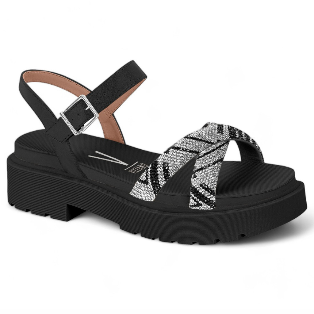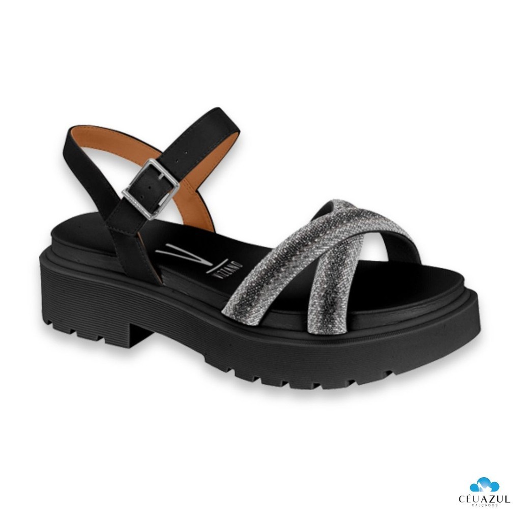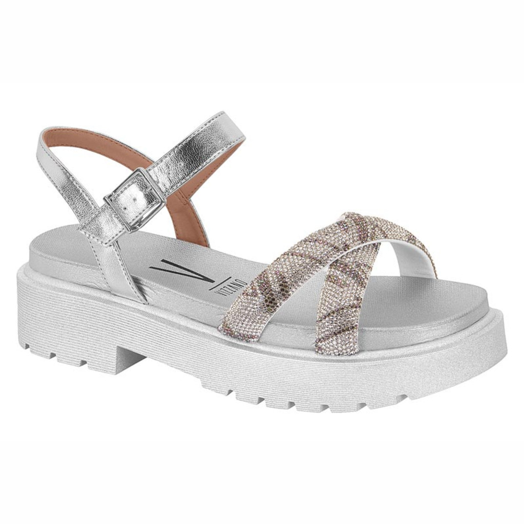 Sandália Papete Feminina Vizzano Tratorada Tiras em X Strass Brilho Conforto