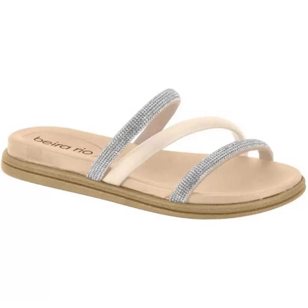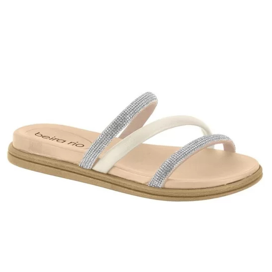 Sandália Feminina Beira Rio Chinelo Birken Tiras Brilho Cristal Branco Strass