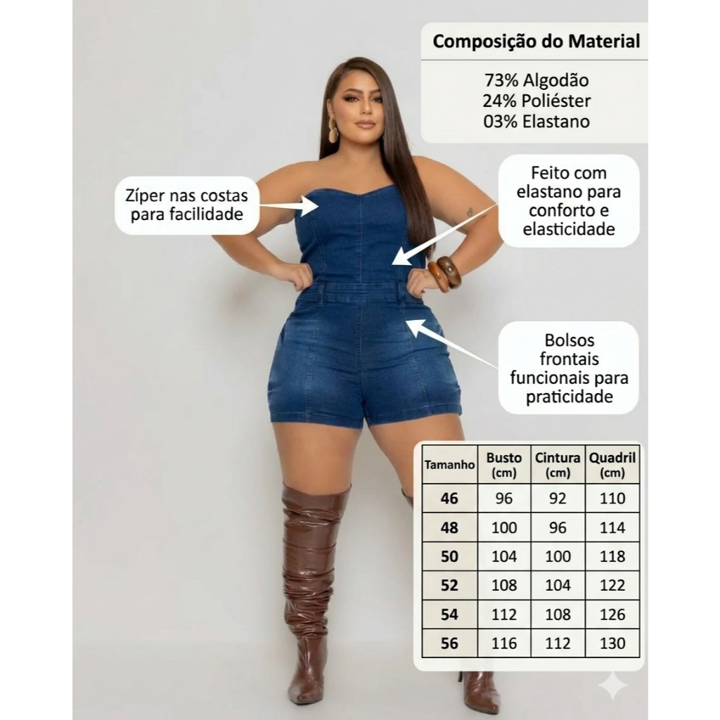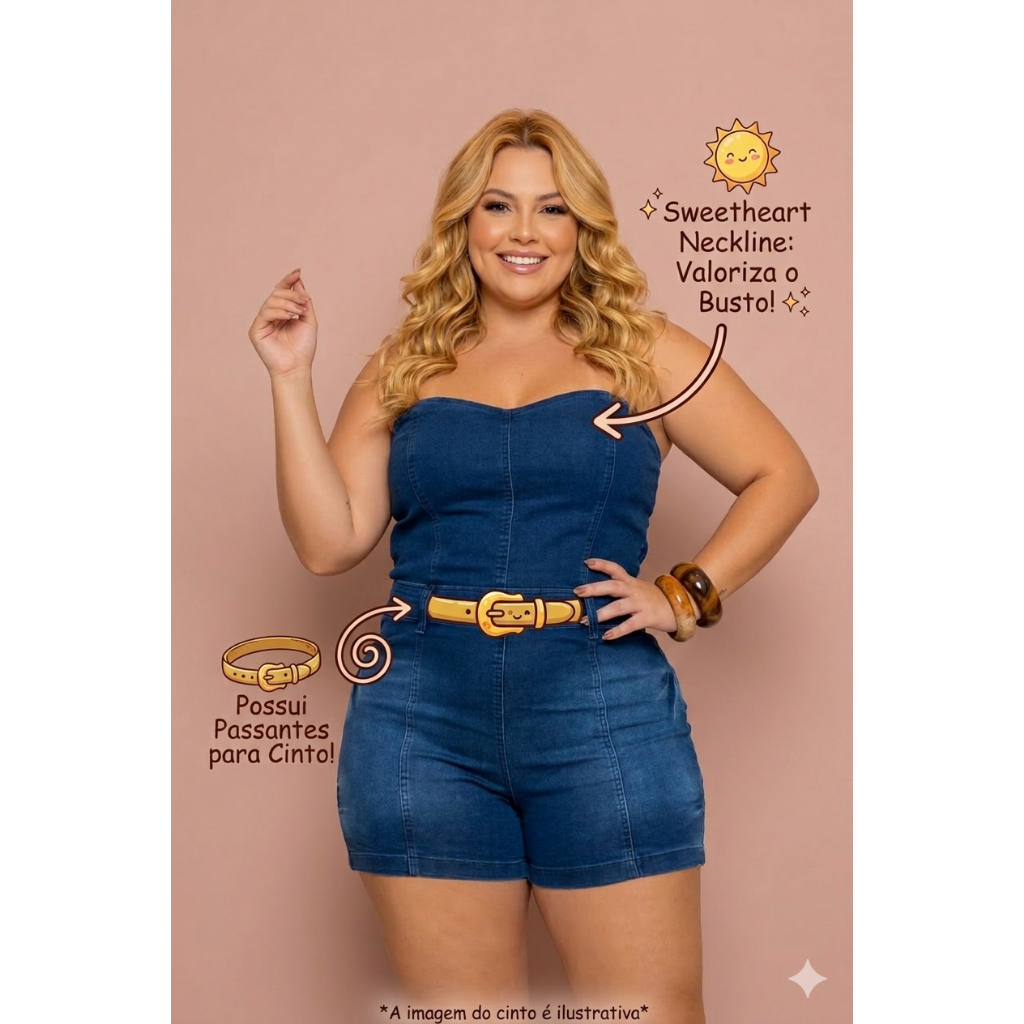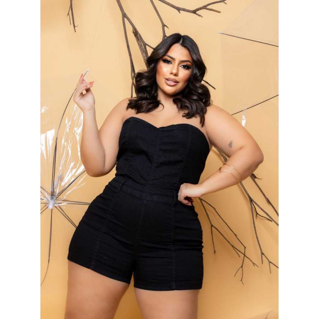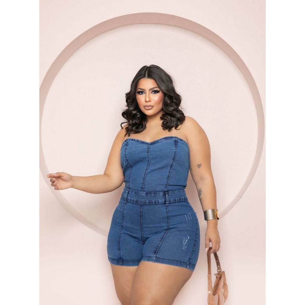 Macacão Plus Size Feminino Jeans com Elastano Macaquinho Verão Shorts Curto
