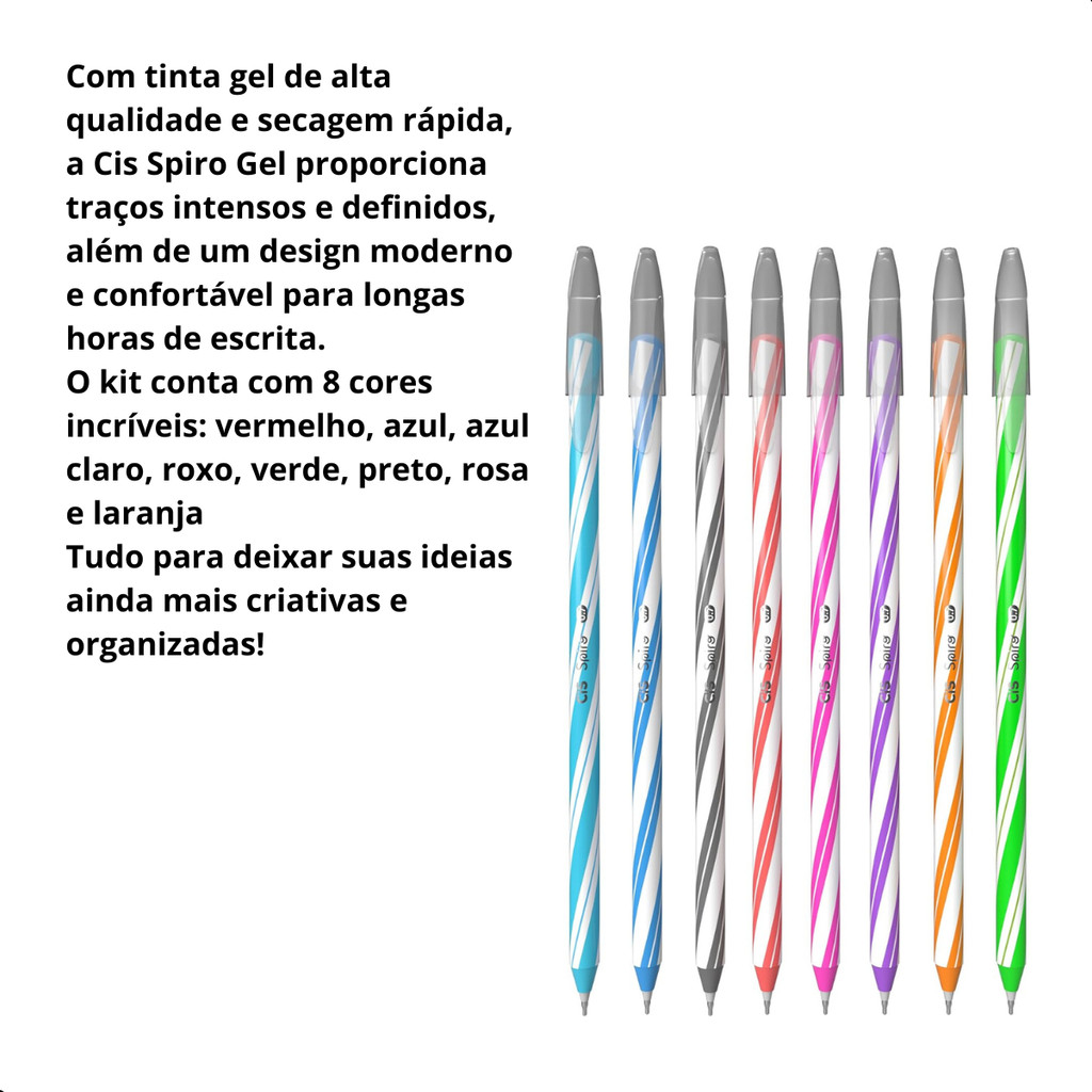 Kit Caneta Esferográfica Cis Spiro Gel 8 Cores Ponta 0.7mm