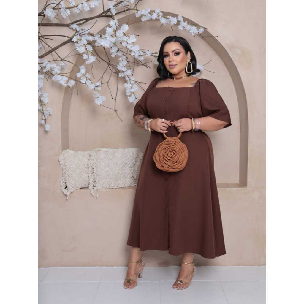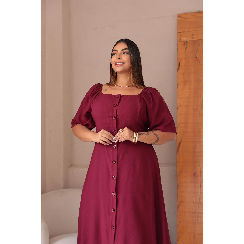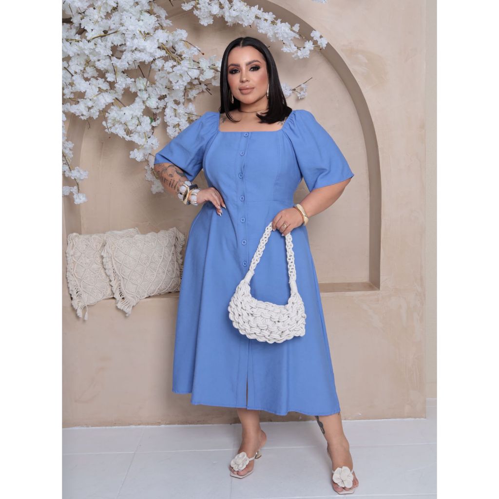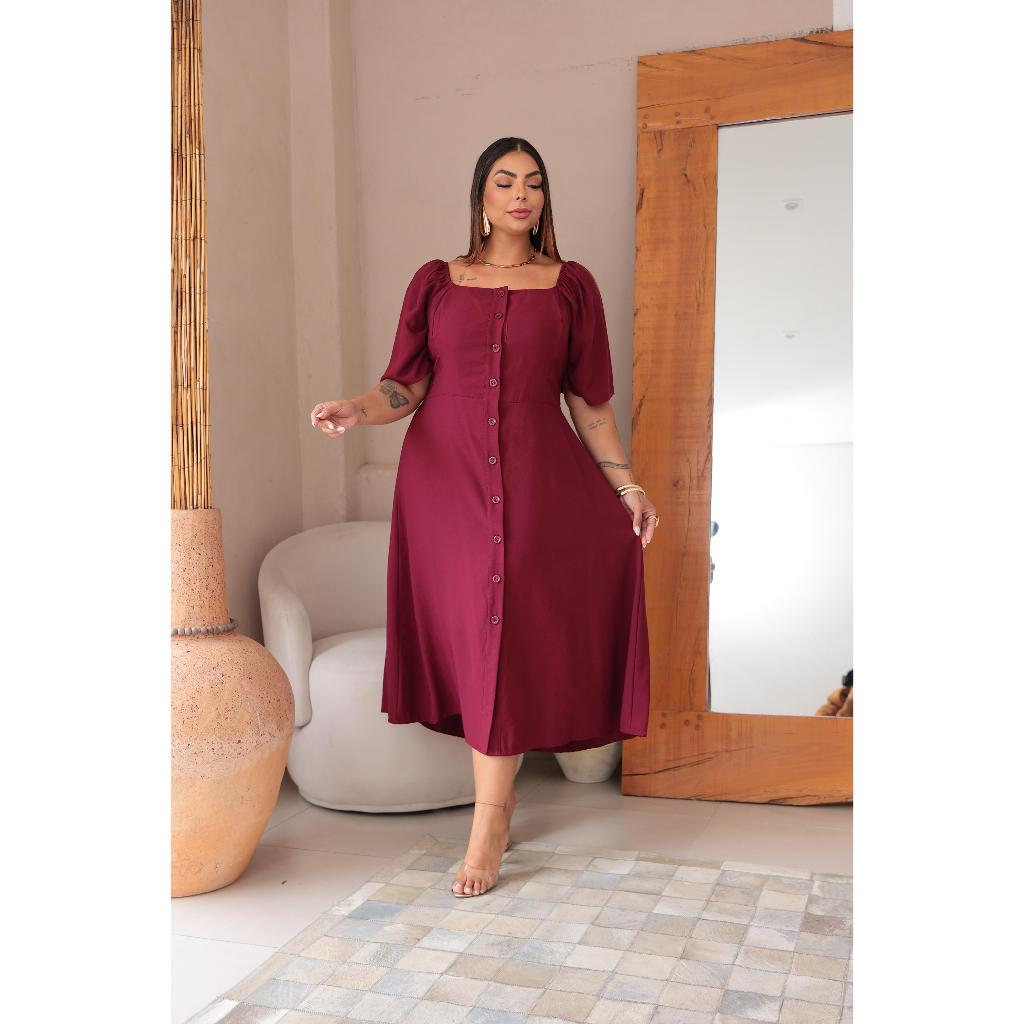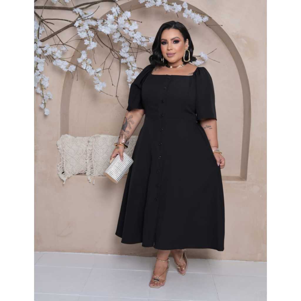 Vestido longuete feminino com detalhe em botões manga curta plus size alfaiataria sensorial