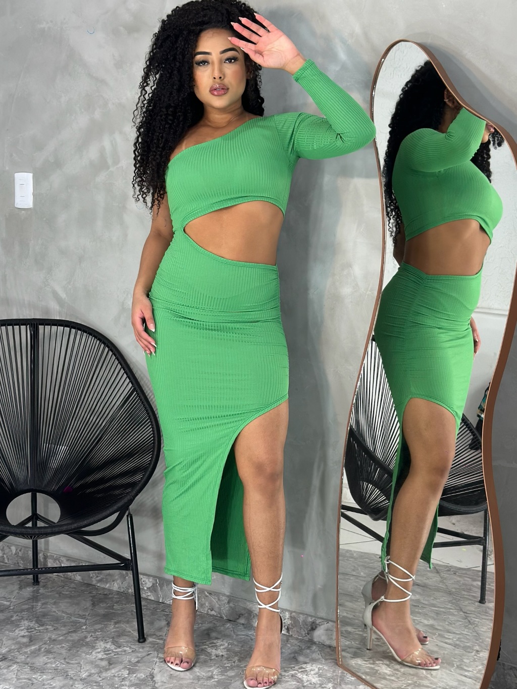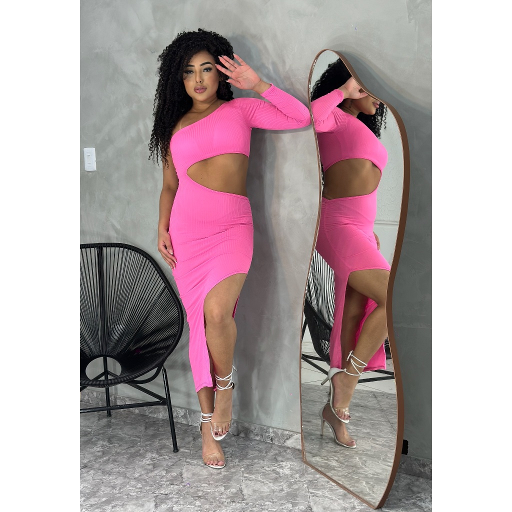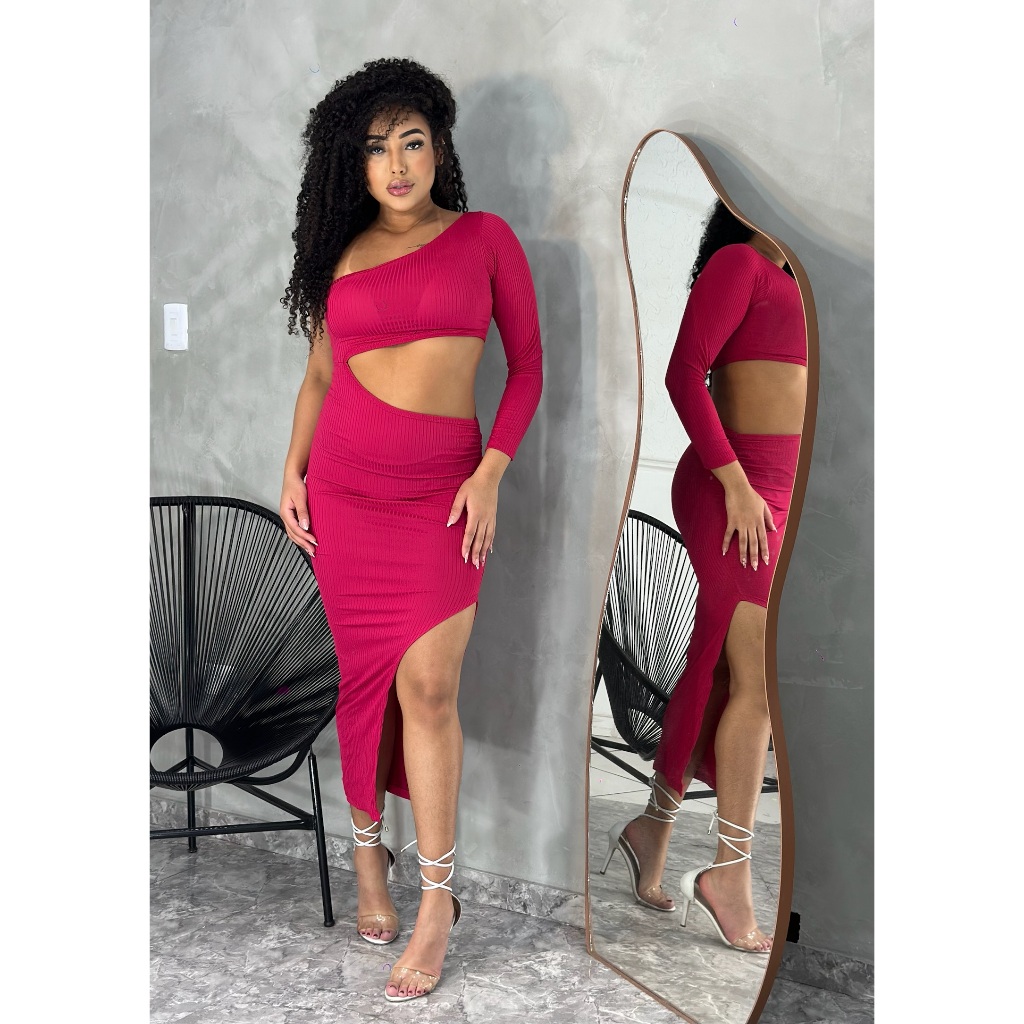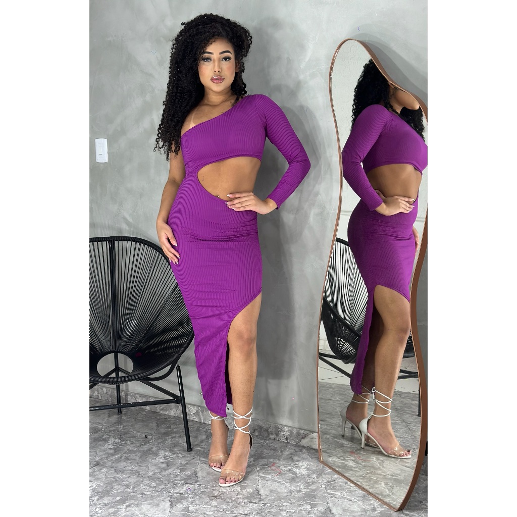 Vestido Midi Aberto na Barriga Ombro Unico Manga longa com Fenda e Drapeado na Lateral