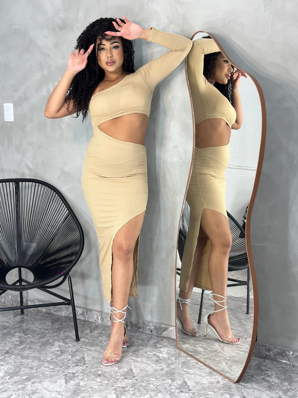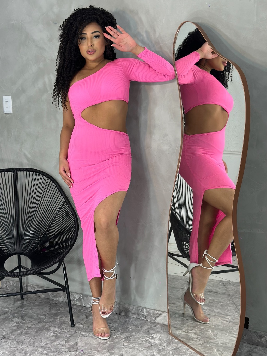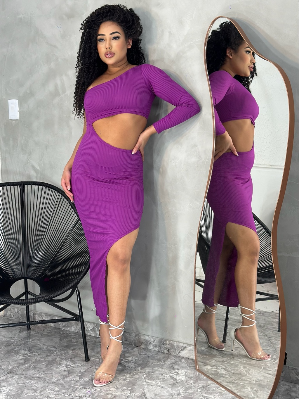 Vestido Midi Aberto na Barriga Ombro Unico Manga longa com Fenda e Drapeado na Lateral