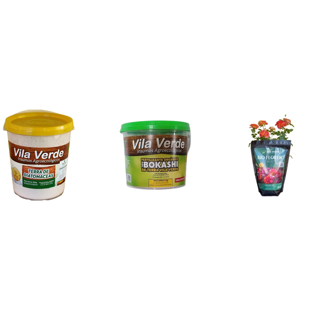 Kit Vila Verde Terra Fértil – Diatomáceas 900g + Bokashi 1kg + BioFlores 900g – Promoção Especial