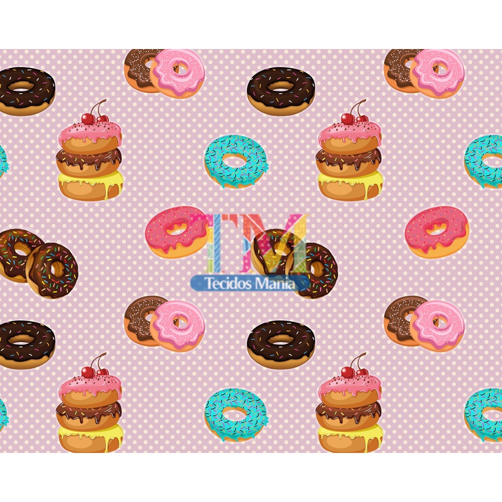 Tecido tricoline, microfibra ou gabardine estampado - Donuts - fundo poá rosa com bege - 0.50 cm