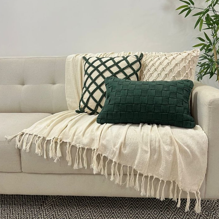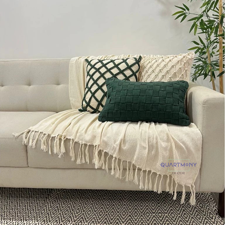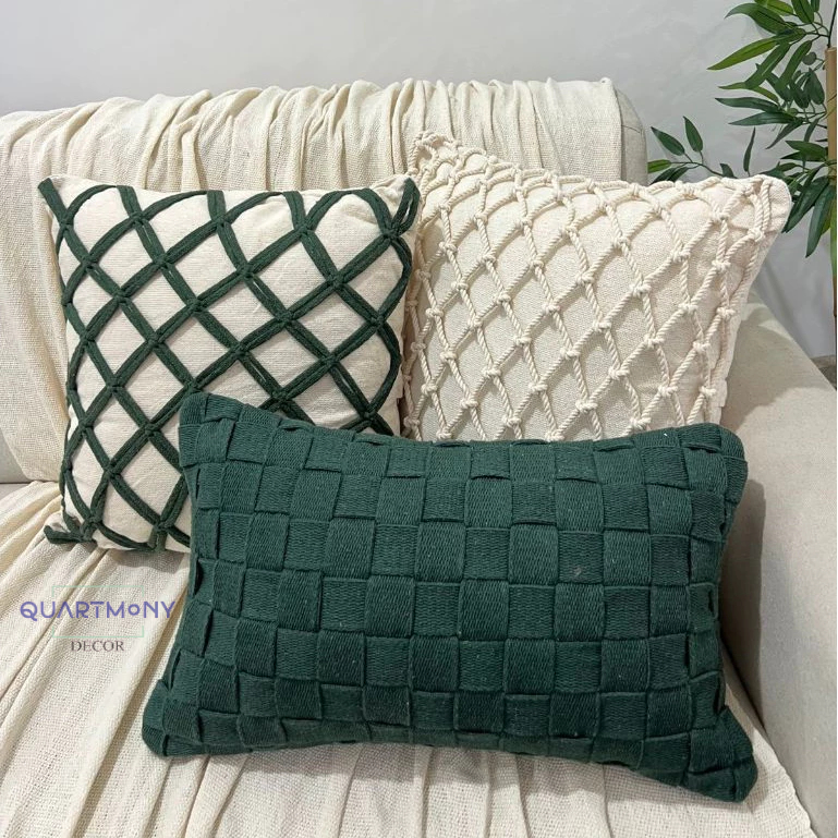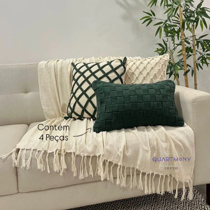 Kit Capa Almofada Macrame Verde Musgo (3 Capas + 1 Manta) Artesanal Moderno Decorativo Algodão