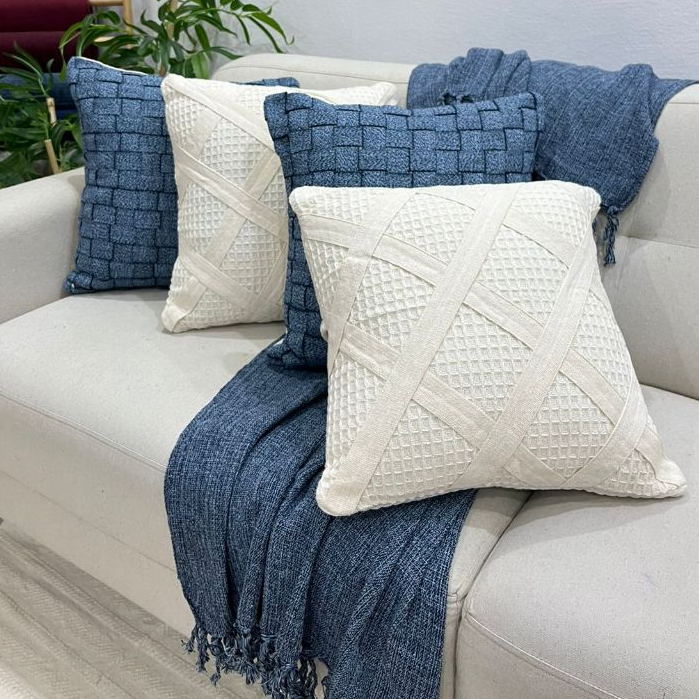 Kit Capa Almofada Fita Losango Azul Jeans Manta Grande Decorativa Sofa Cama Rustica Carnaval