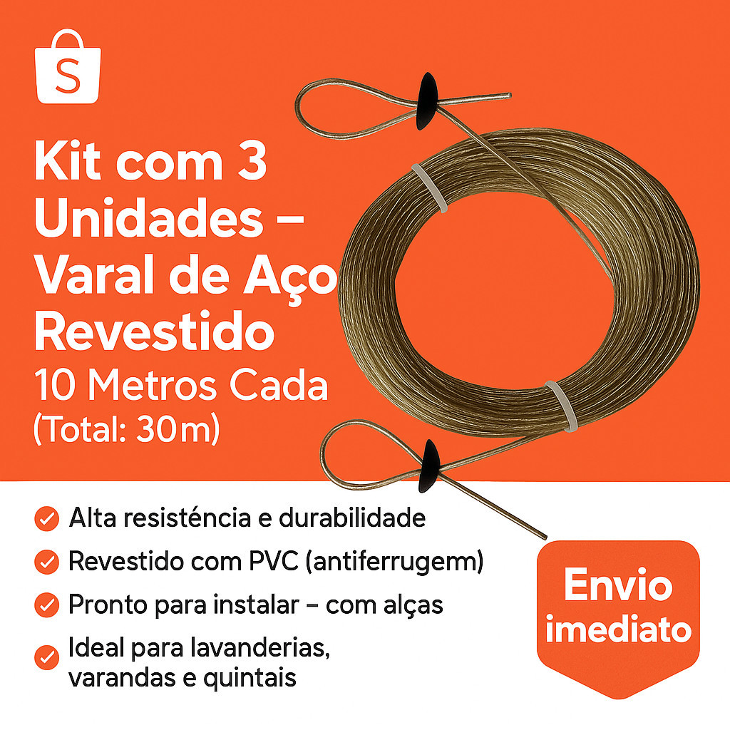 Kit 3 Varal de Aço Revestido Corda de Varal Reforçada 10 Metros cada