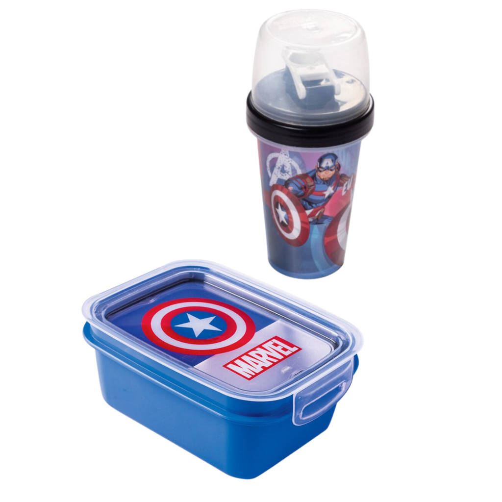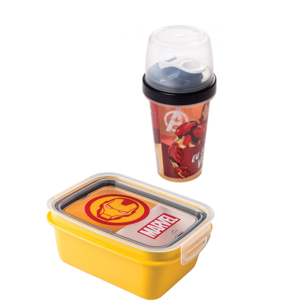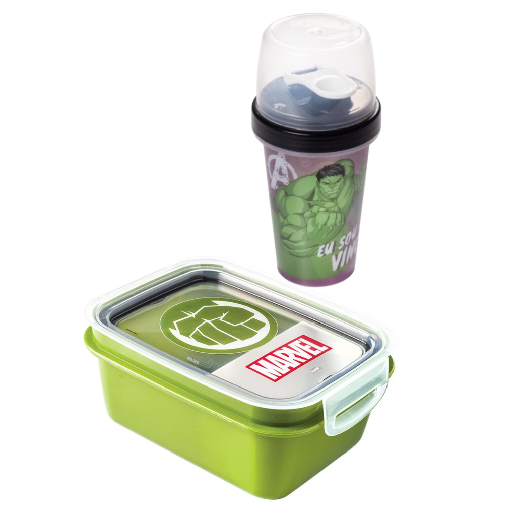 Kit Lanche Mini Marmita Pote Infantil C/ Garrafinha Mini Shakeira 320ml Copo Infantil Super Heróis