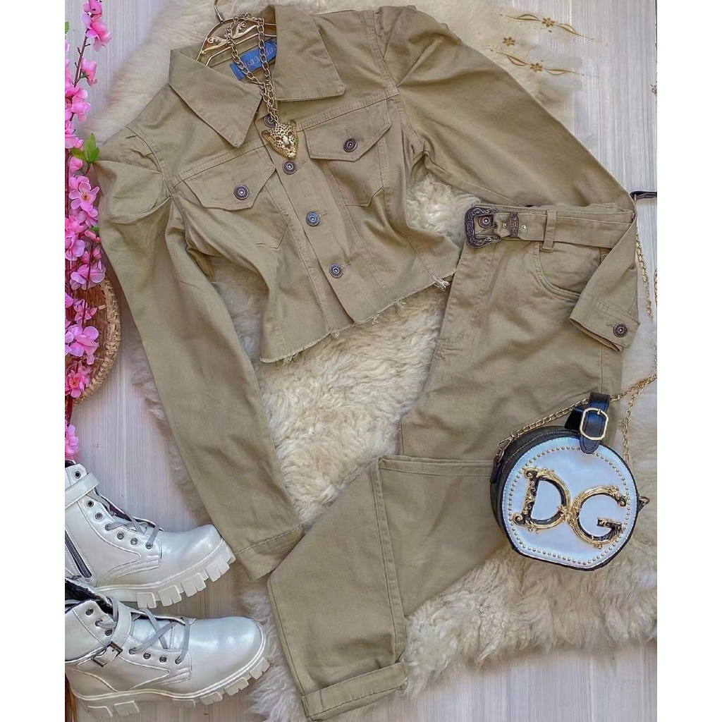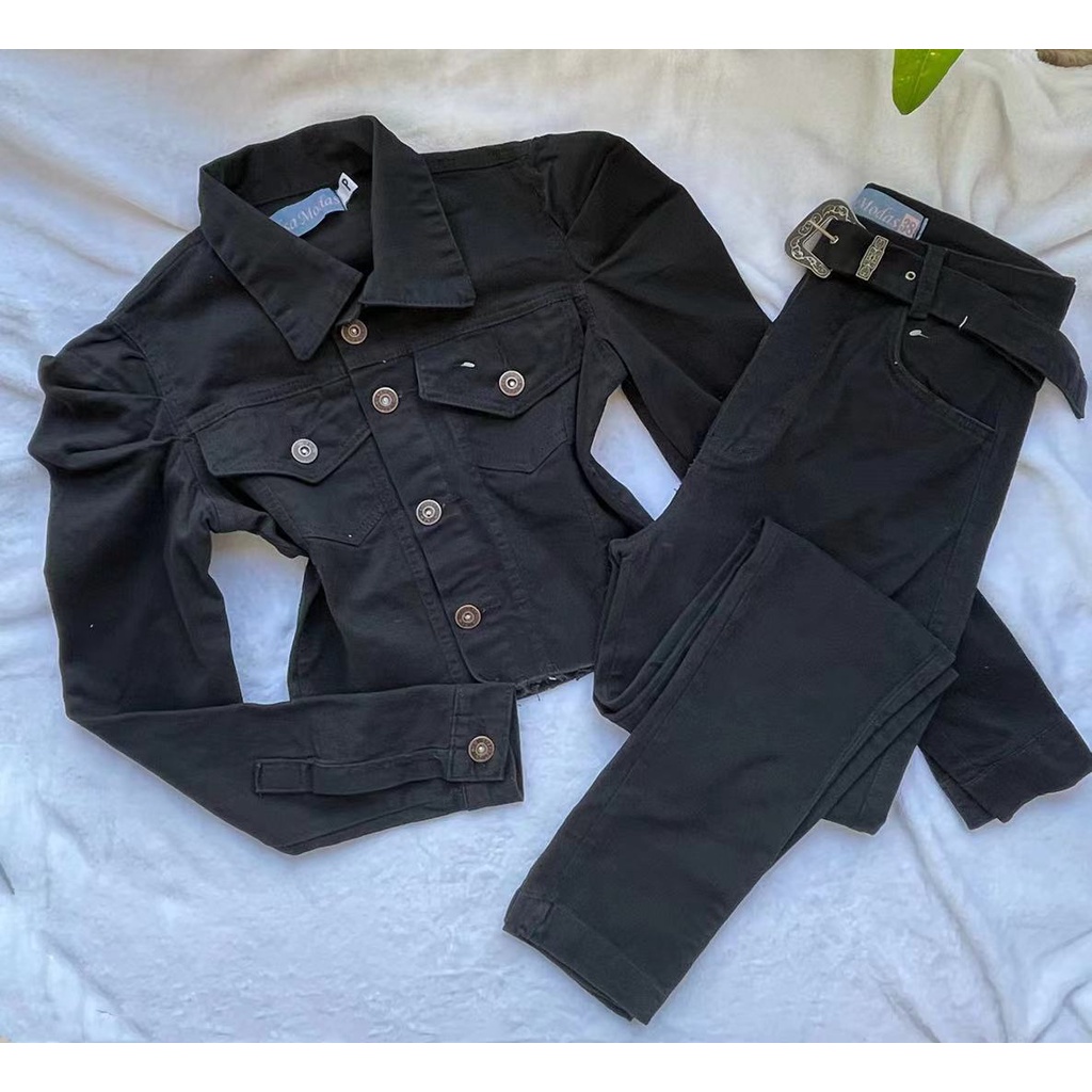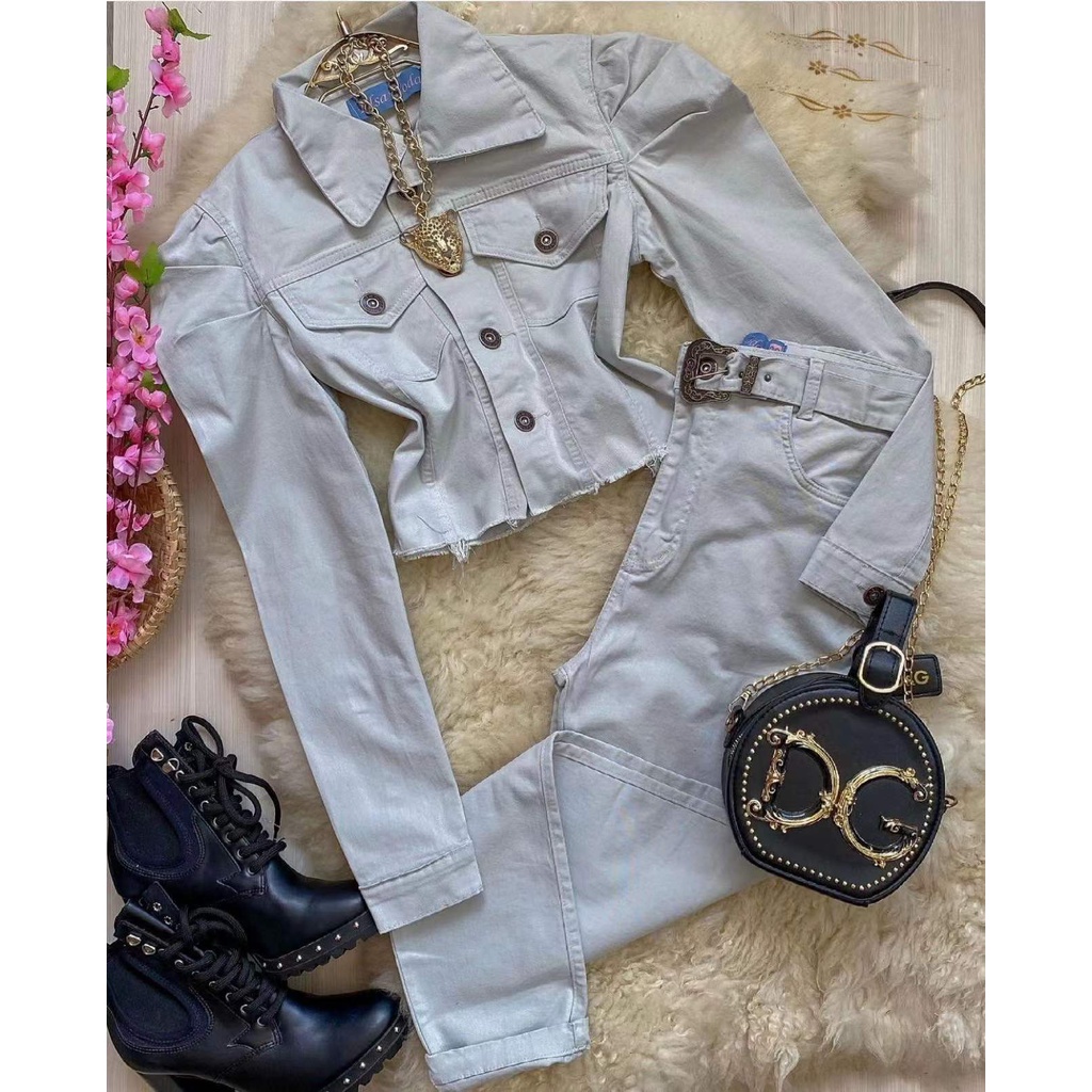Conjunto jeans coloridas Jaqueta, Calças feminina com lycra