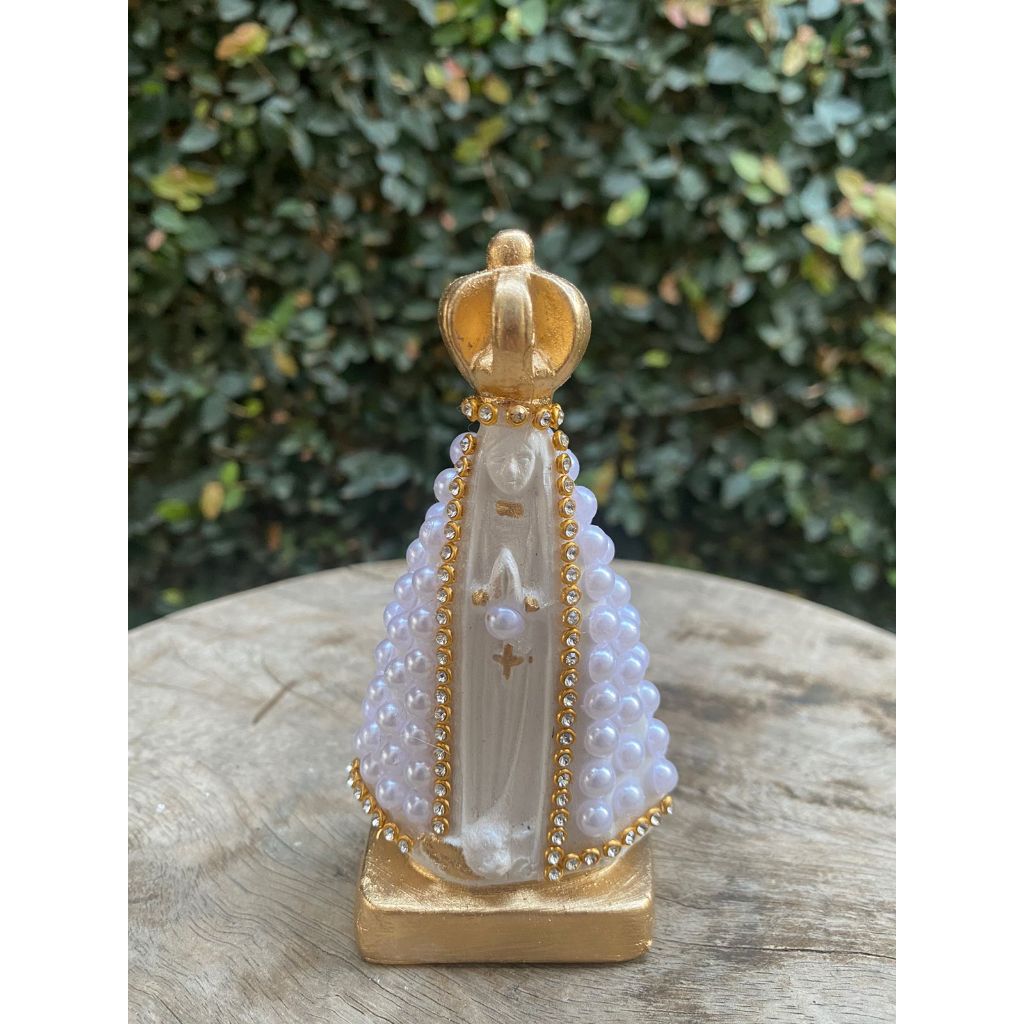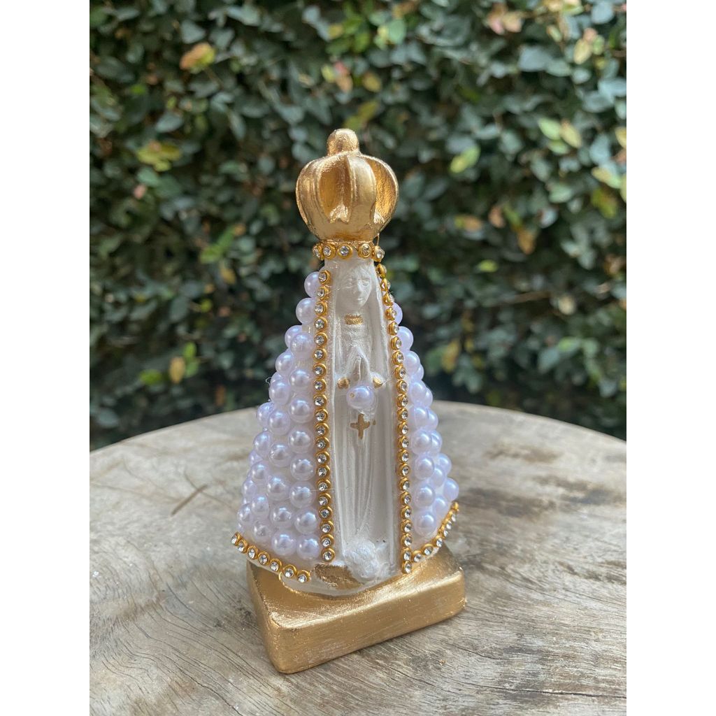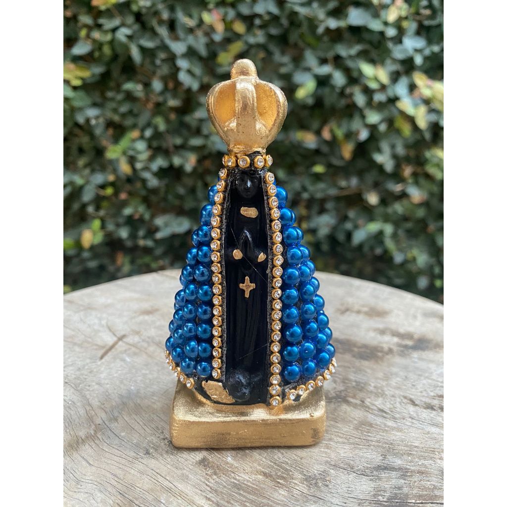 Imagem Nossa Senhora Aparecida 10cm com base quadrada coroa fixa detalhes com Pérola e strass, pintura a base de resina