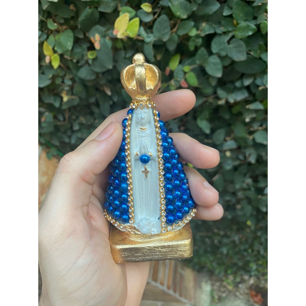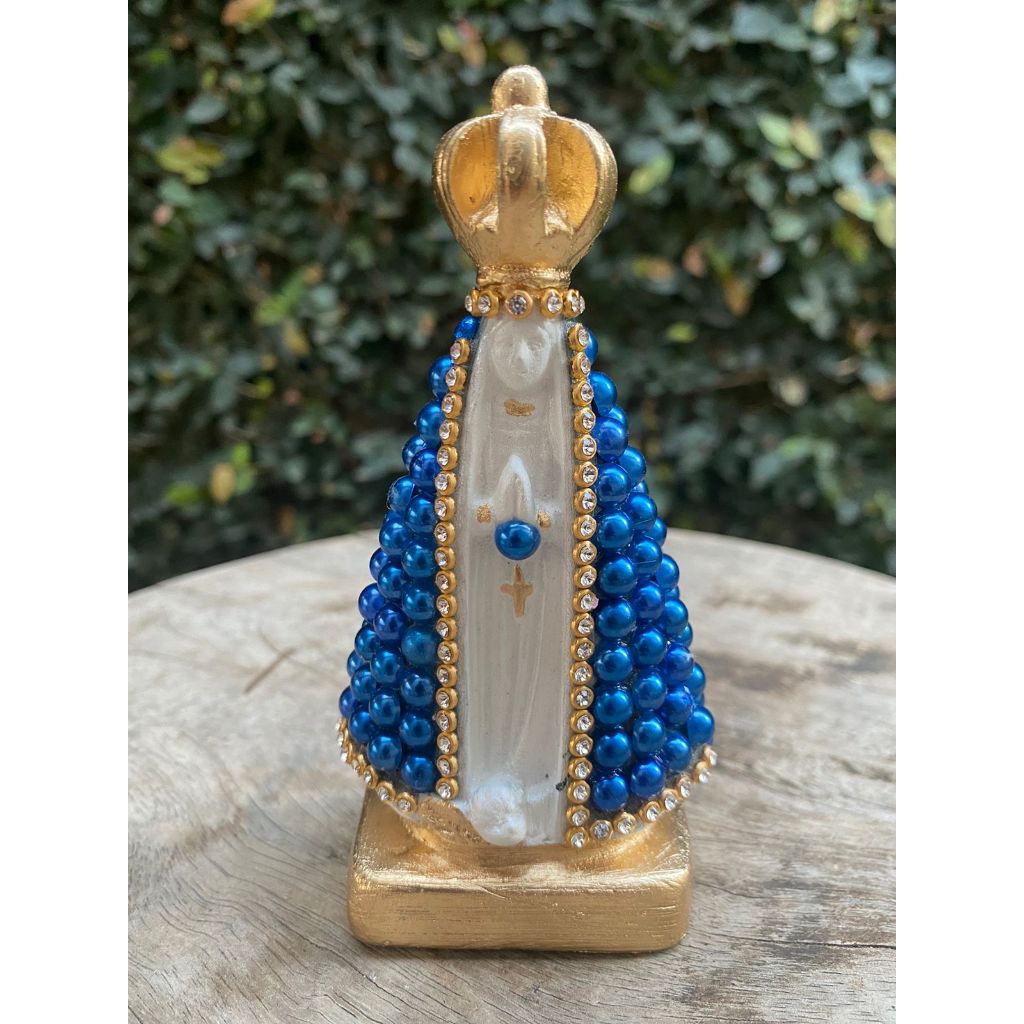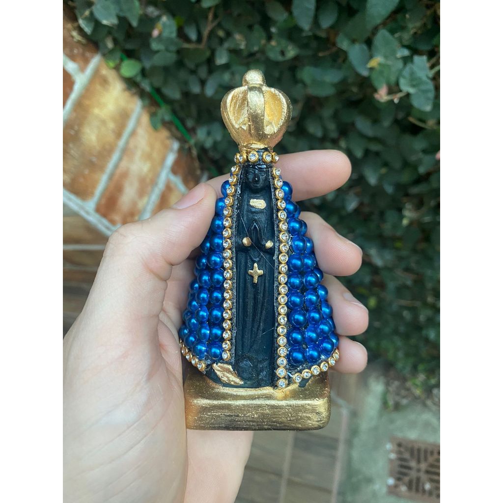 Imagem Nossa Senhora Aparecida 10cm com base quadrada coroa fixa detalhes com Pérola e strass, pintura a base de resina