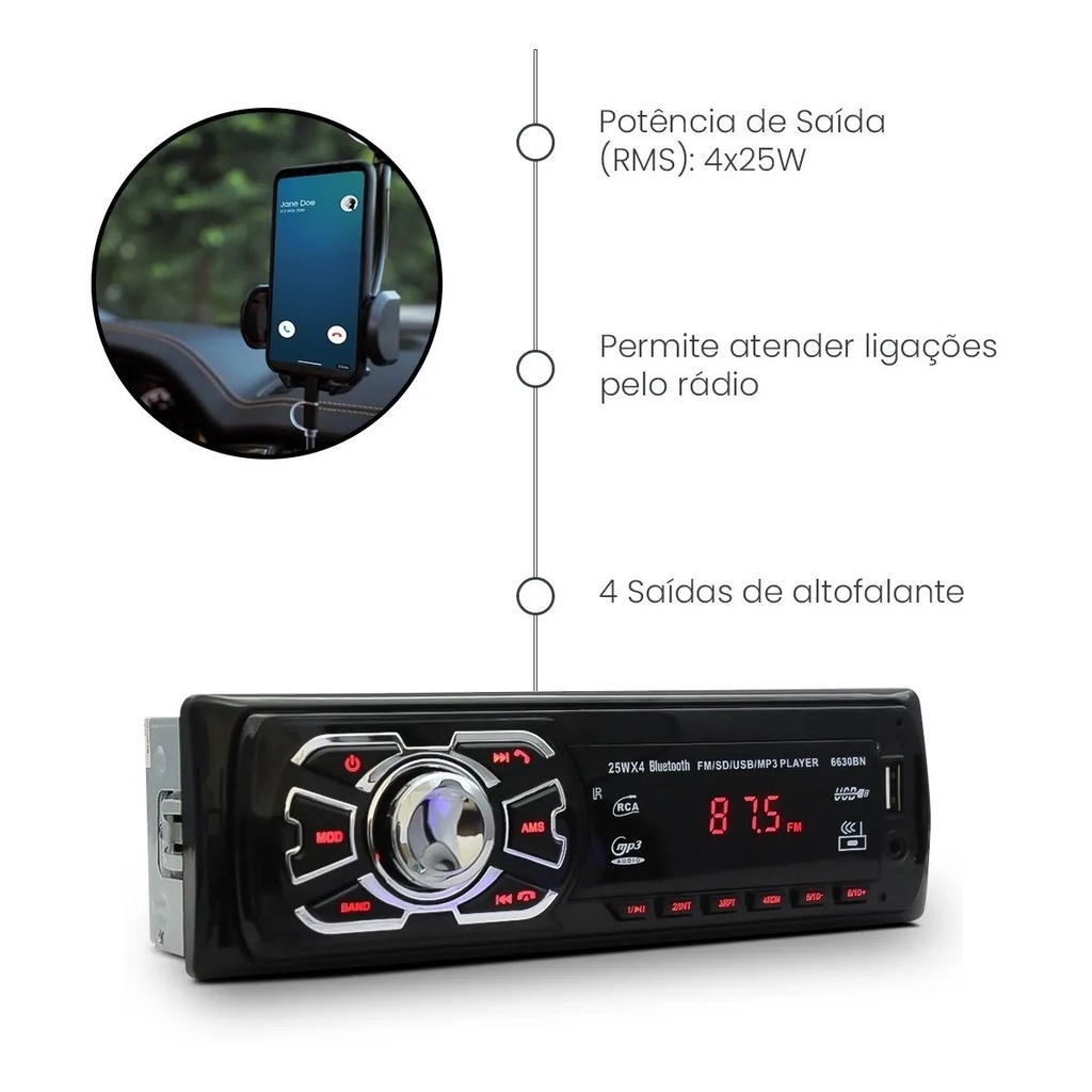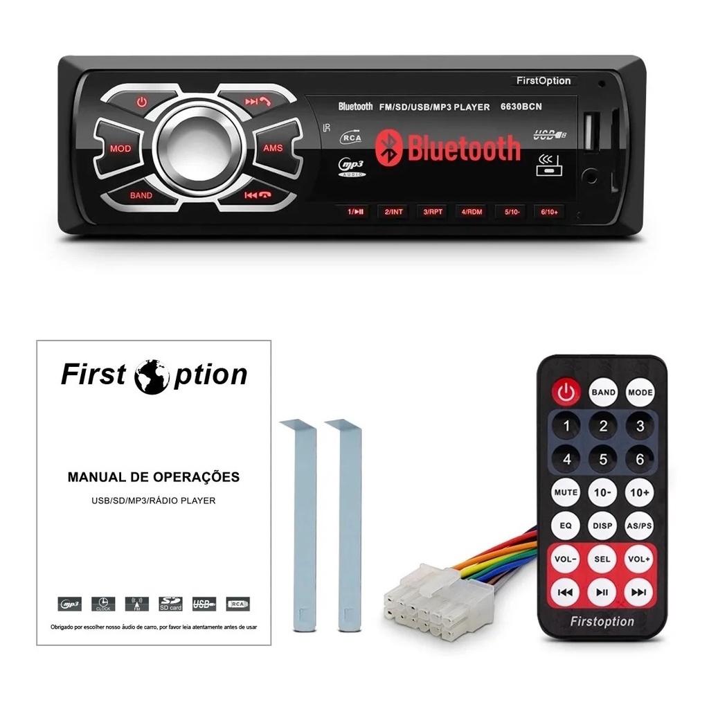 Aparelho de Som Automotivo Rádio MP3 Player Som de carro Bluetooth USB SD Aux. 4x25w Modelo First Option Controle remo