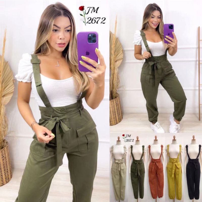 Macacão Jardineira Feminino /com Bolsas e Cinto/Estampa Liso