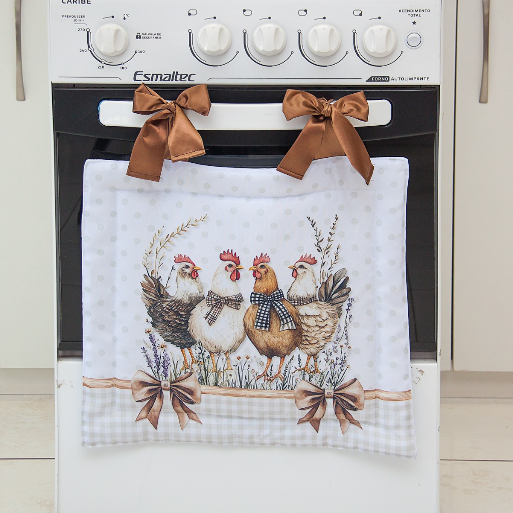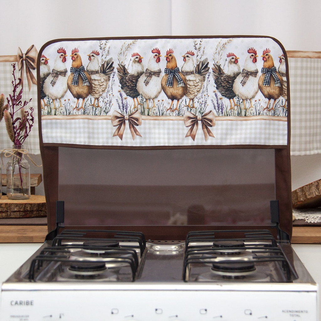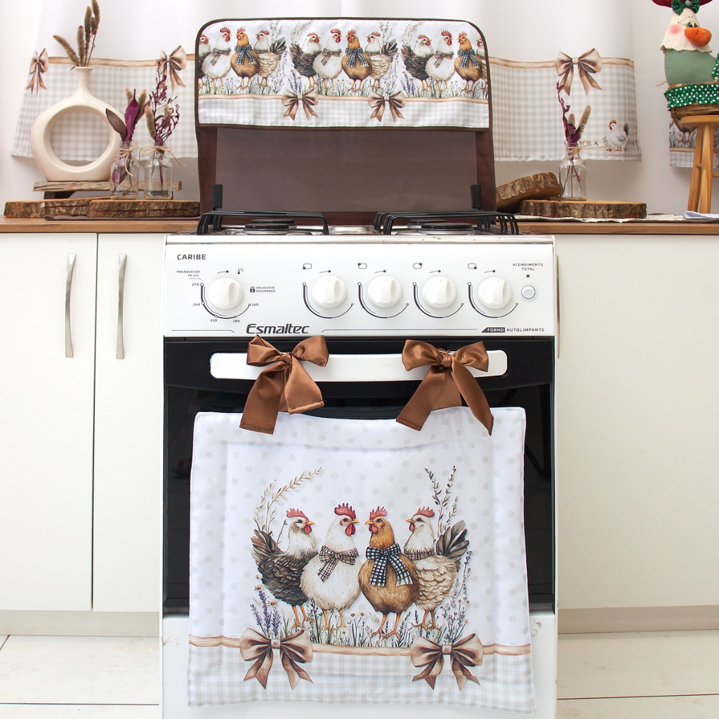 Kit para Fogão 5 e 6 Bocas Cortina Forno + Capa da Tampa Vidro - Estampa Digital Galinha