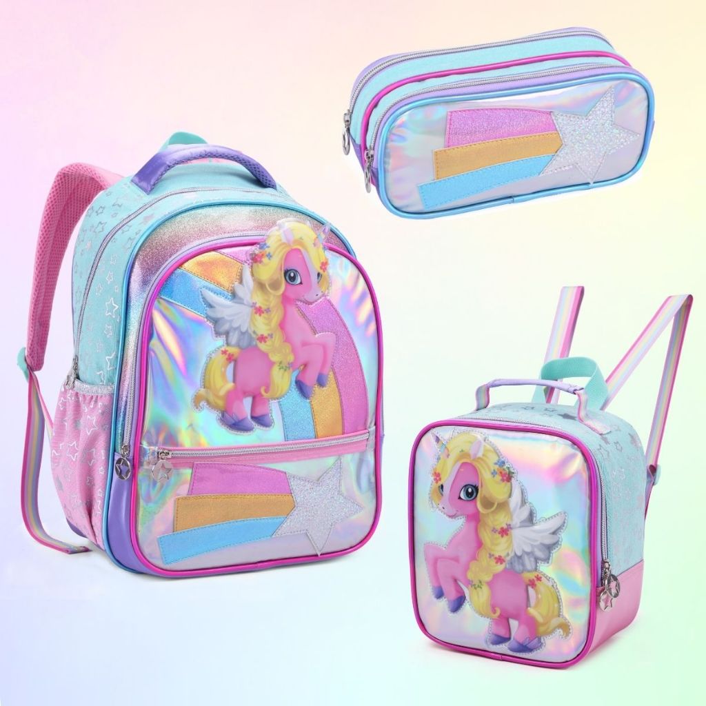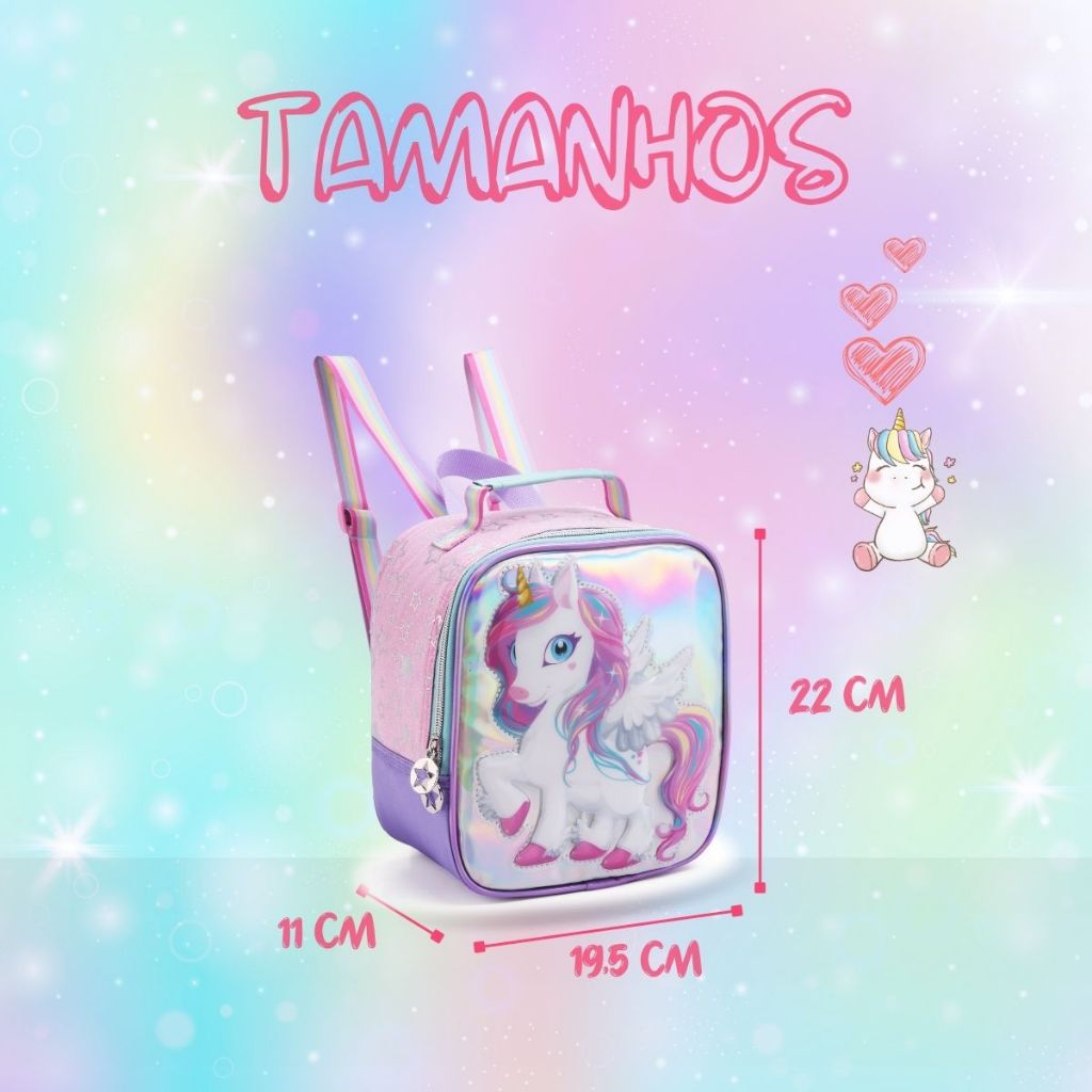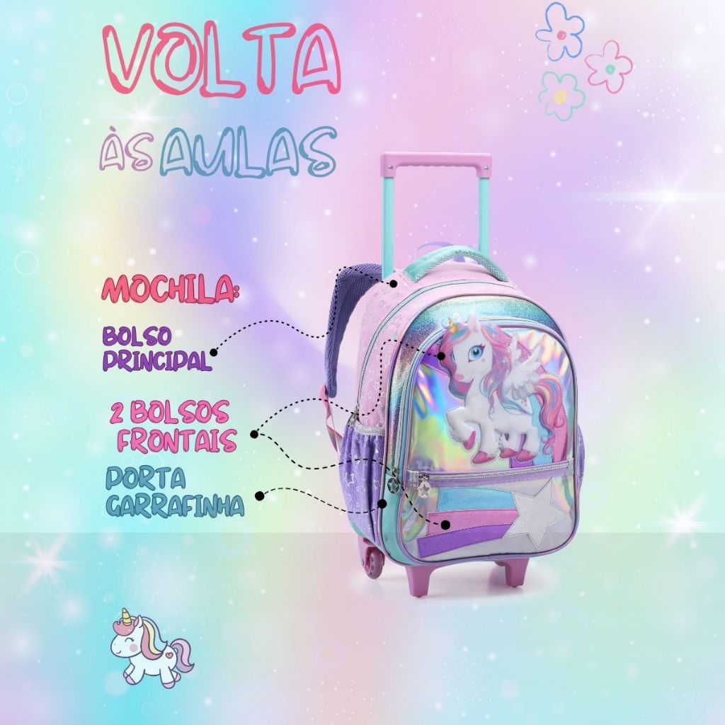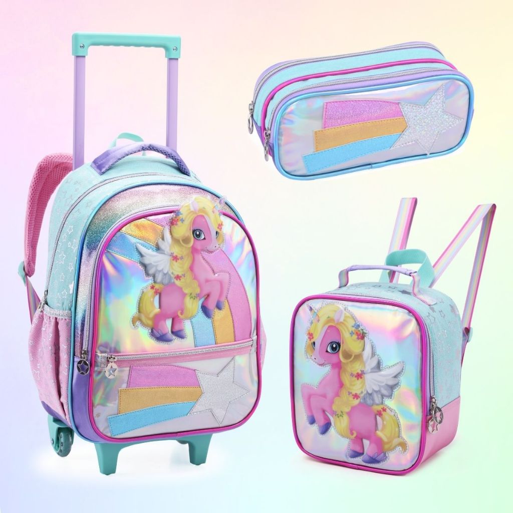 Mochila Escolar Feminina Infantil Menina Unicornio Com Rodinhas Estojo e Lancheira Térmica