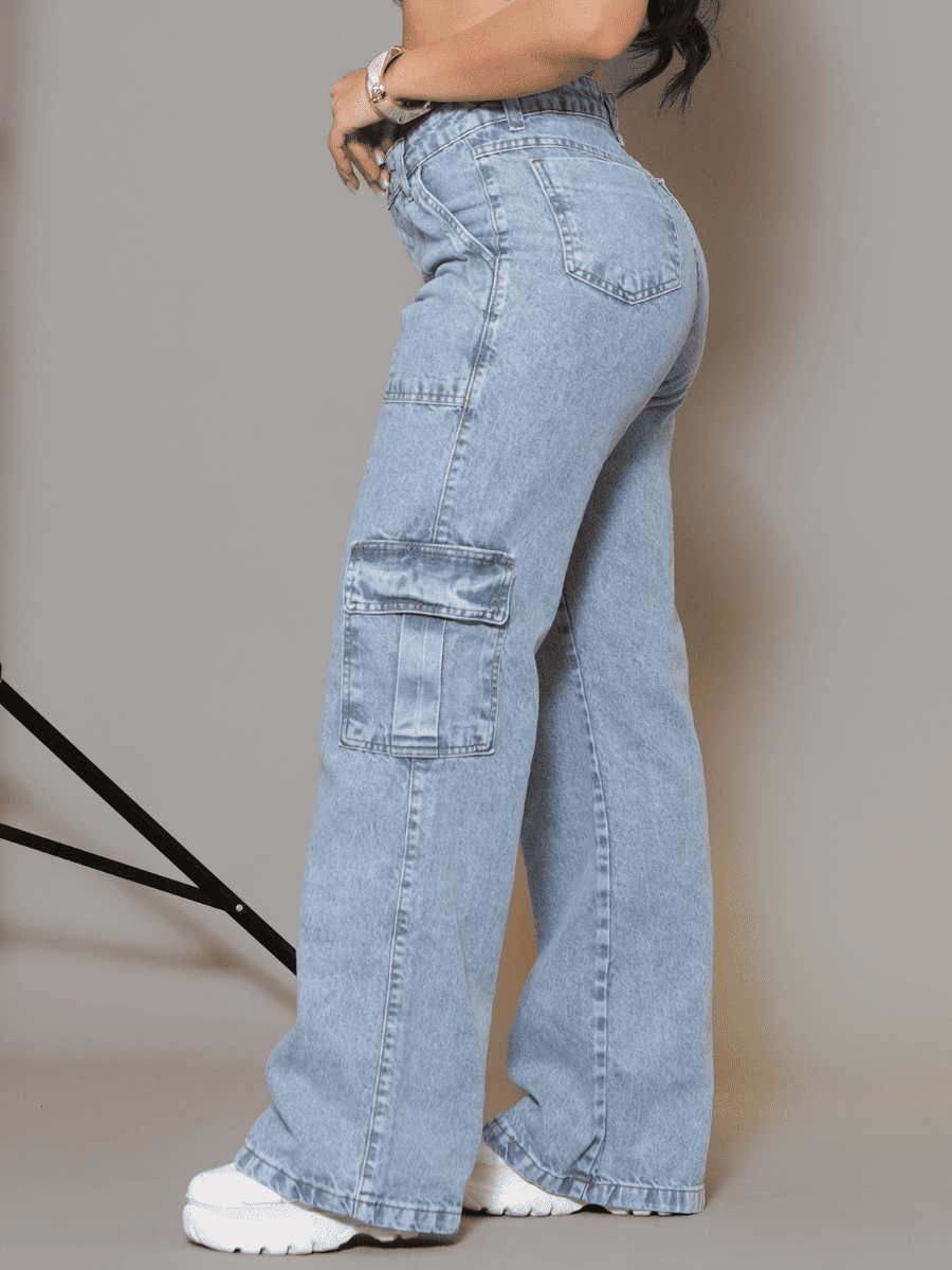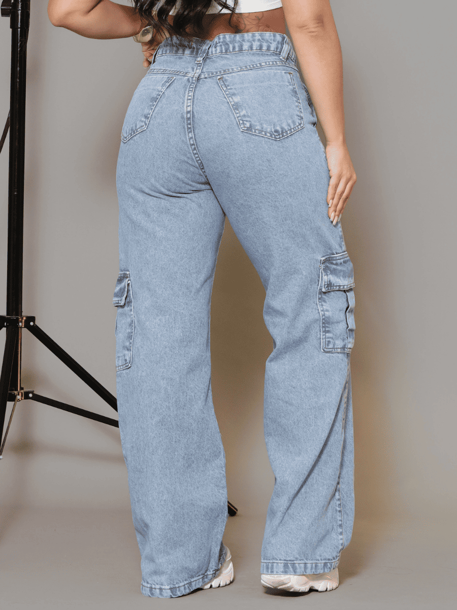 Calça Cargo Wide Leg Jeans Cintura Alta Pantalona Marmorizada Bolso Carpinteiro 100% Algodão com 6 Bolsos Funcionais.