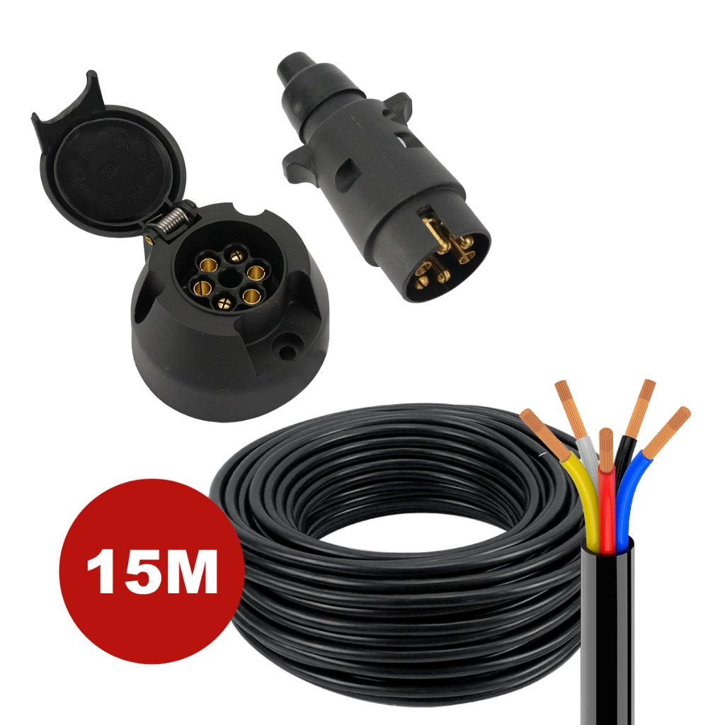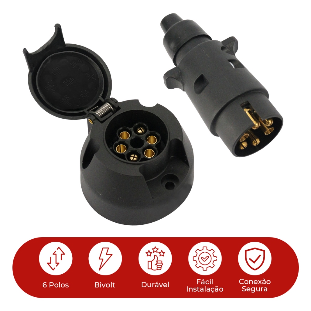 Kit Tomada Engate Reboque 6 Polos Macho Fêmea + Cabo PP 5x1m Resistente Vários Tamanhos Carretinha