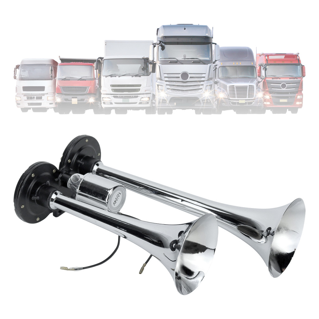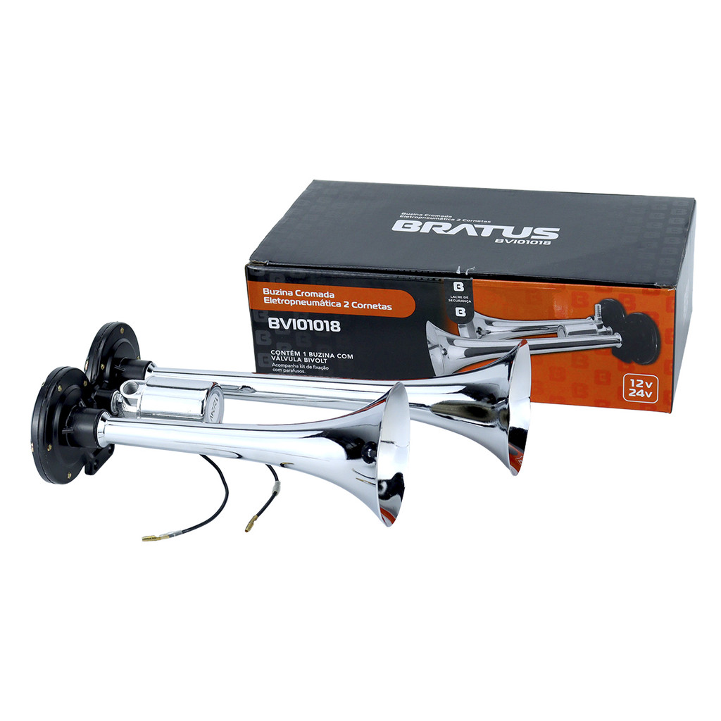 Buzina 2 Cornetas De Caminhão Bivolt Cromada Corneta Buzina Bratus A Ar Alta Performance Som Forte