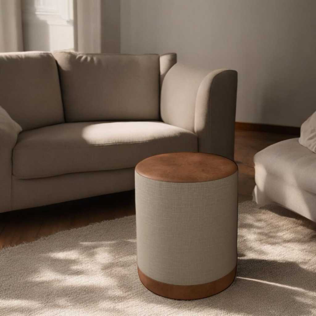 KIT 2 PUFF Closet Penteadeira Banqueta Redonda LINHO BEGE ASSENTO EM COURO CARAMELO 42cm x 34cm.DAKOTA