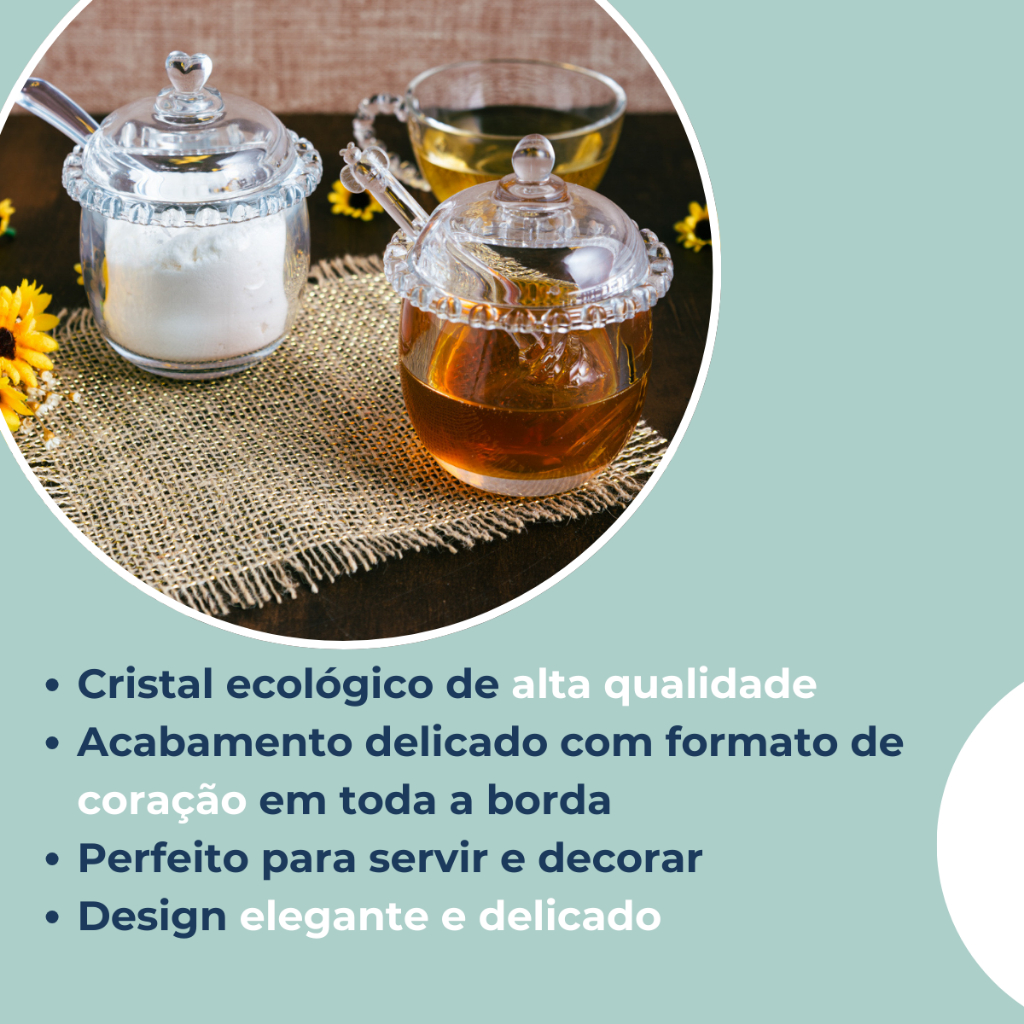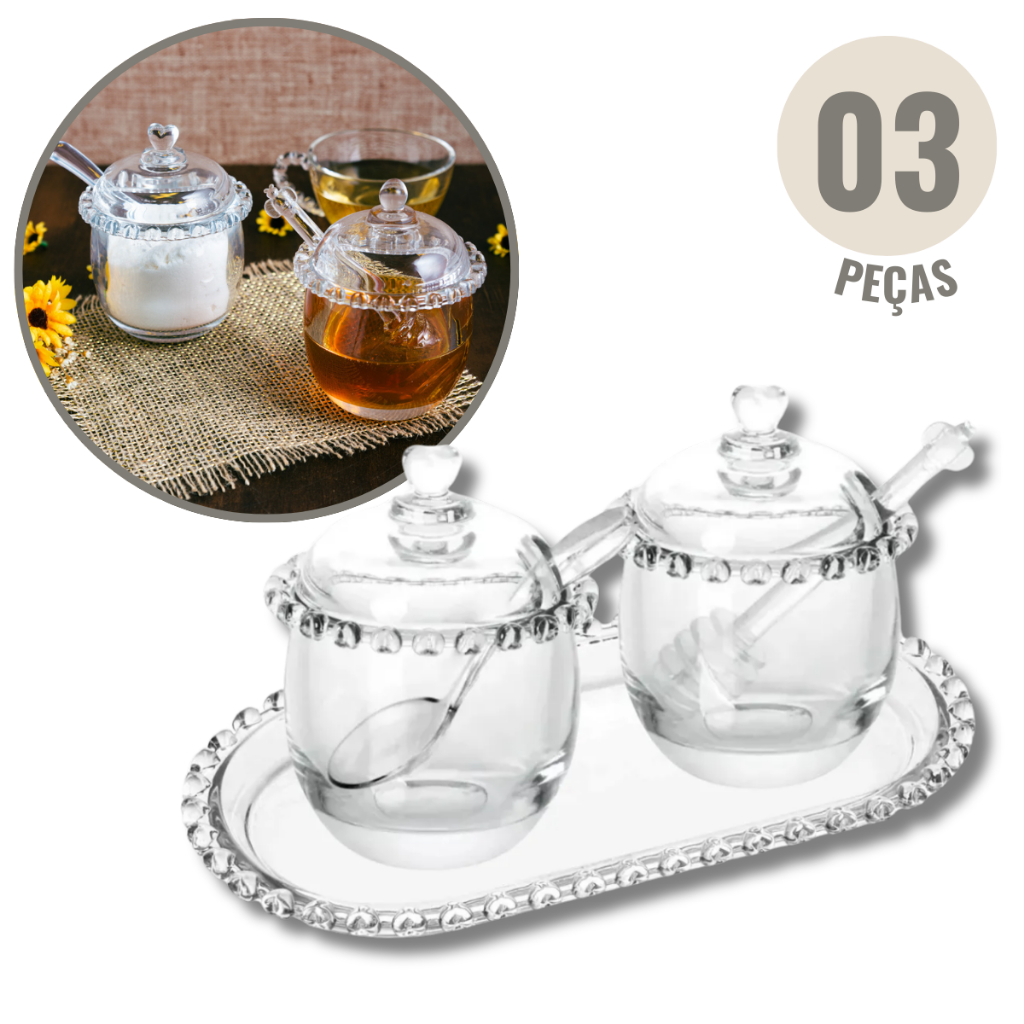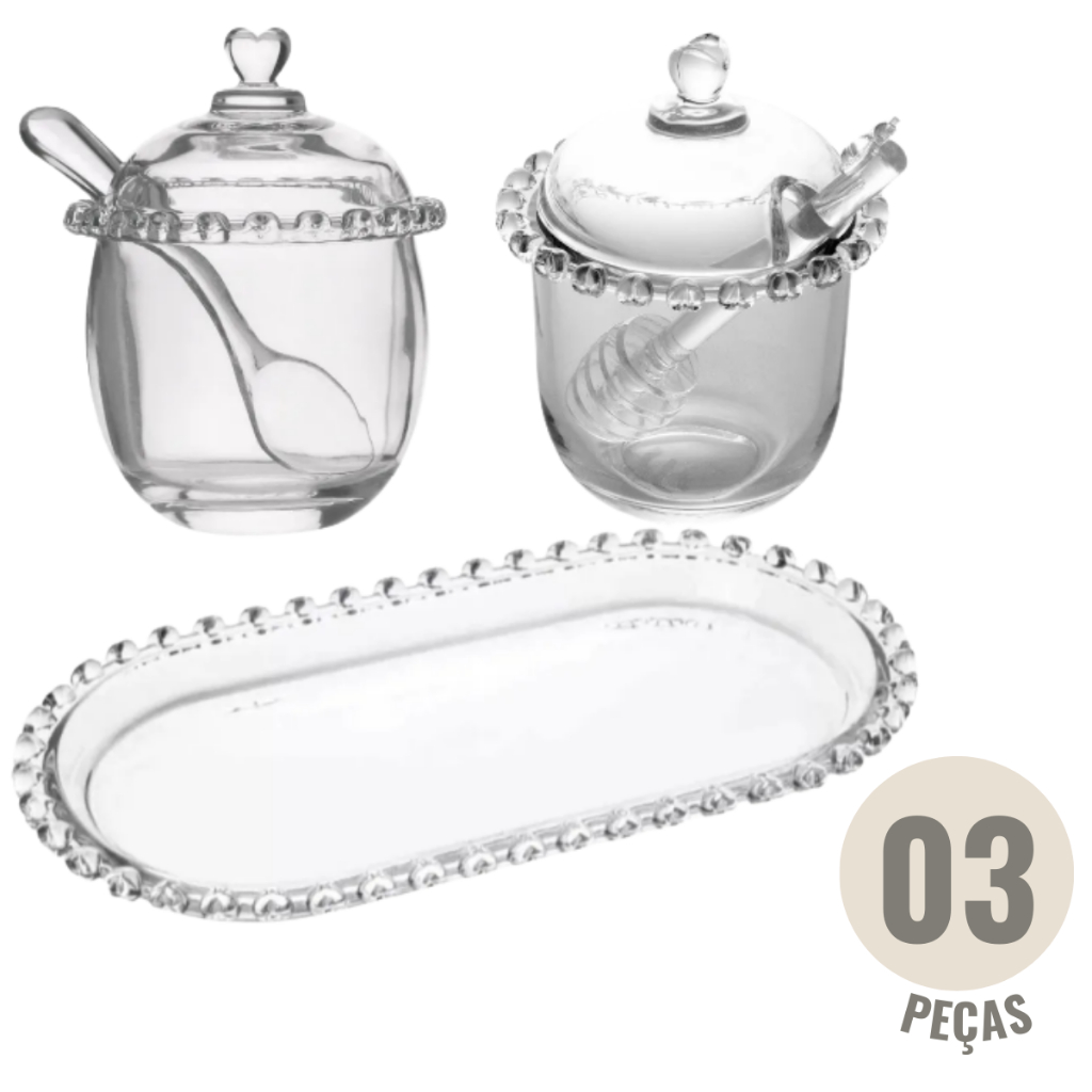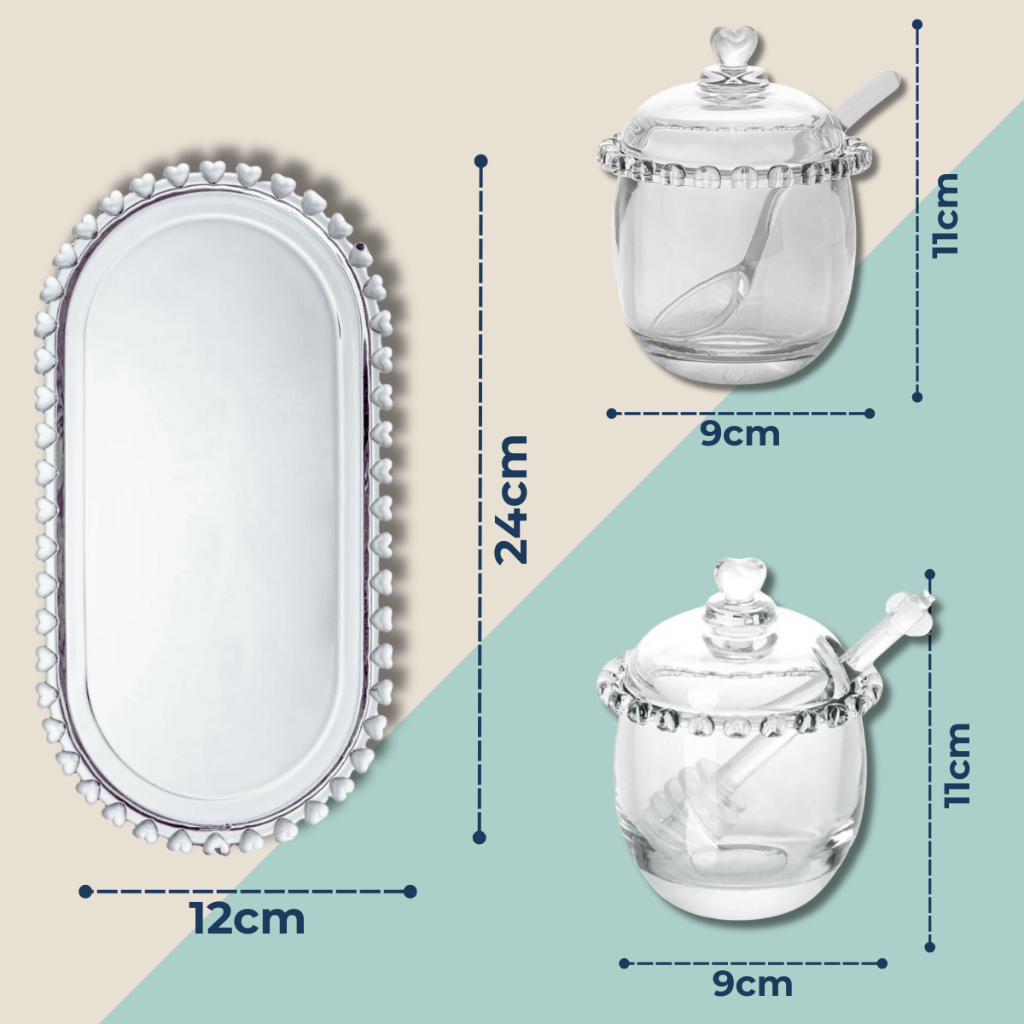 Kit Açucareiro Meleira Travessa 3 Peças Coração Bolinha Em Vidro Lyor