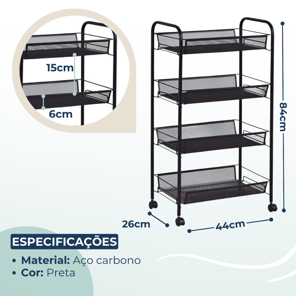 Carrinho Organizador Fruteira Retangular 4 Andares Com Rodinhas Casa Cozinha