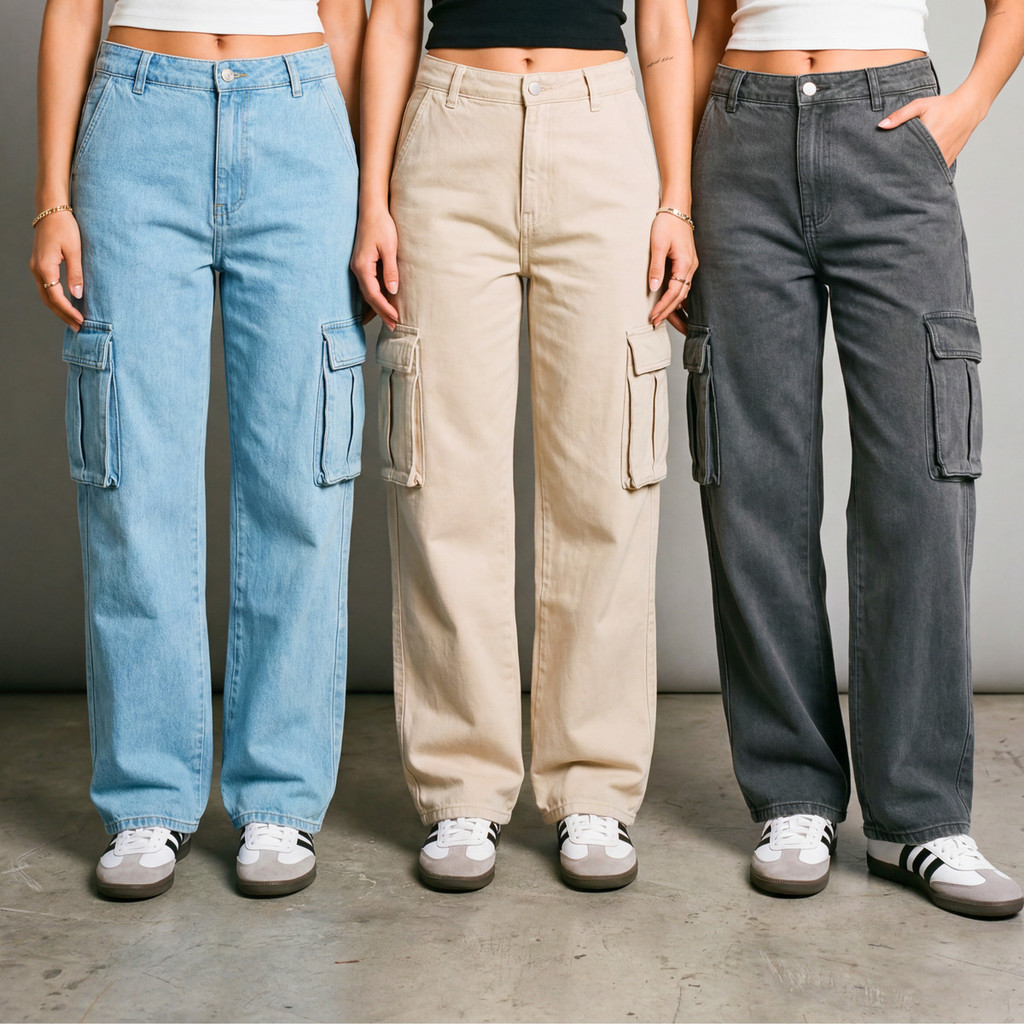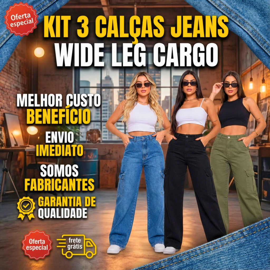 Kit 3 Calça Cargo Jeans Feminina Wide Leg 34 Ao 44 + 5 Cores