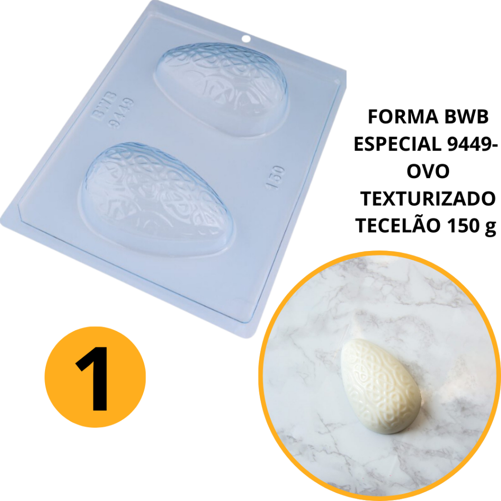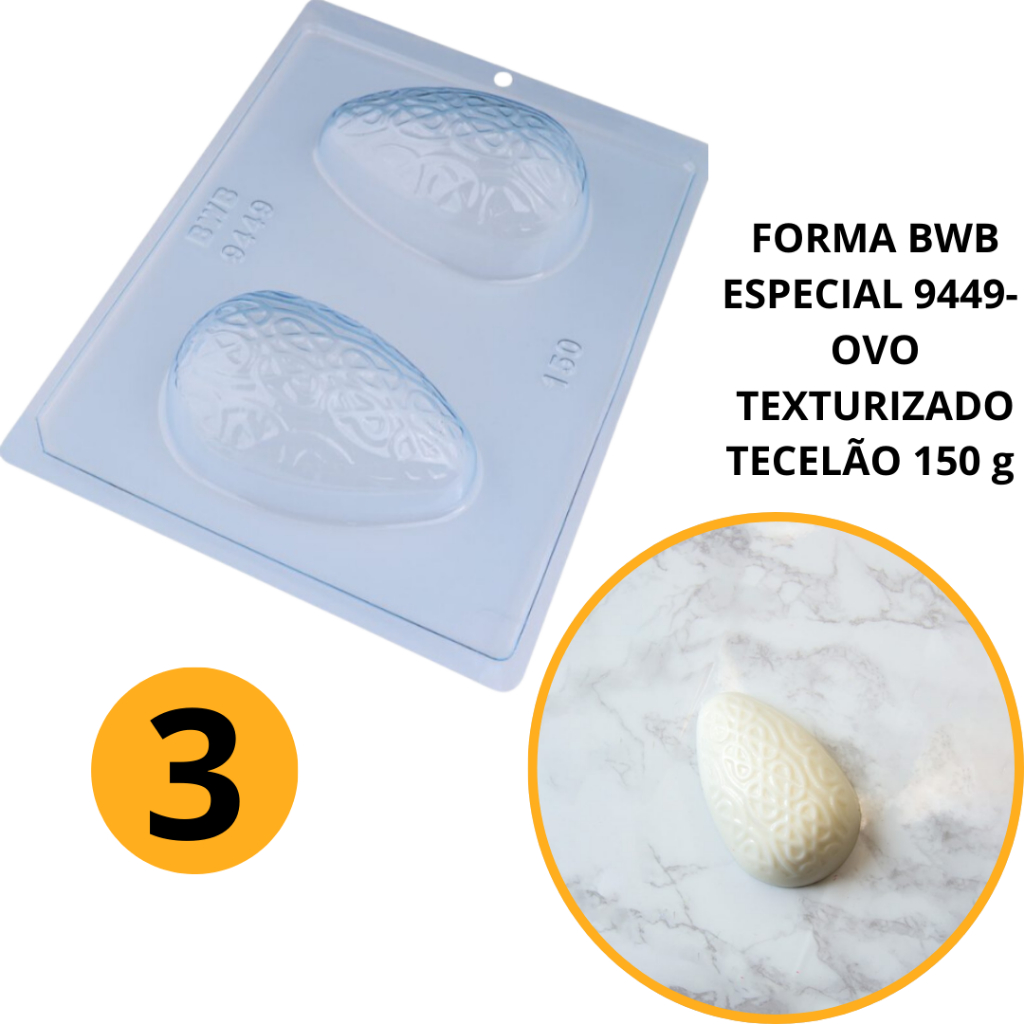 1~4 Forma BWB Com Silicone (3 partes) Para Chocolate Cód. 9449 - Ovo Texturizado Tecelão 150g. Páscoa (CHOCO)