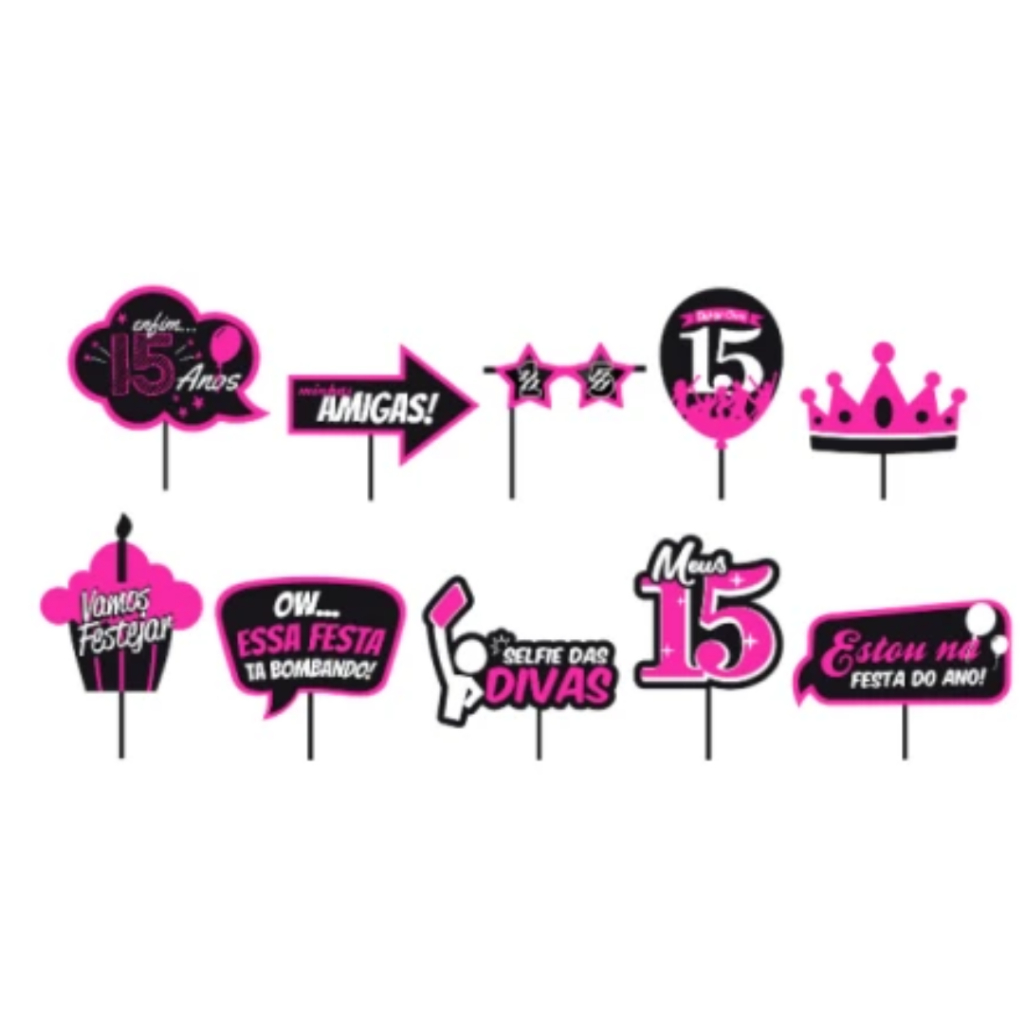 KIT 10 PLAQUINHAS DIVERTIDAS SELFIE ANIVERSÁRIO 15 ANOS DEBUTANTE (COD 11)