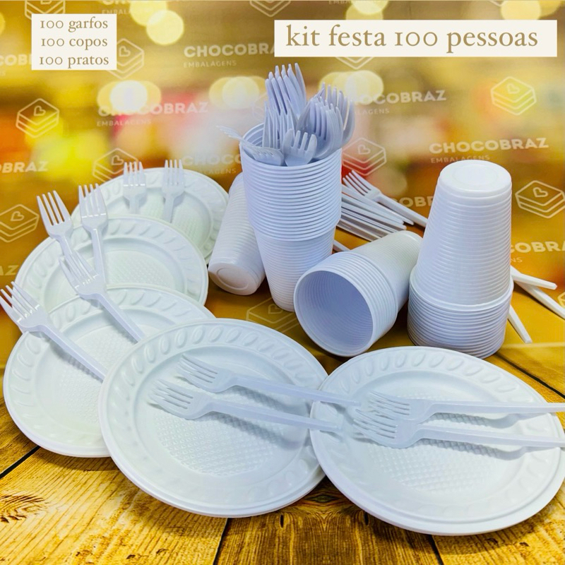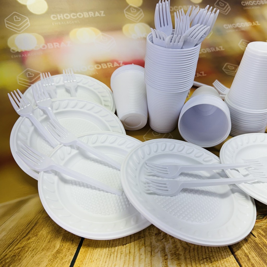 Kit Festa 50~200 PESSOAS ECONOMICO BRANCO GARFO + PRATO + COPO 30 % OFF