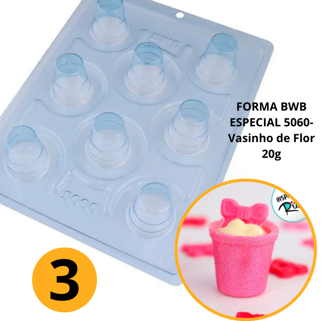 1~4 FORMA PARA CHOCOLATE BWB COM SILICONE (3 PARTES) COPINHO CÓD.:5060 - VASINHO DE FLOR 20g (CHOCO)