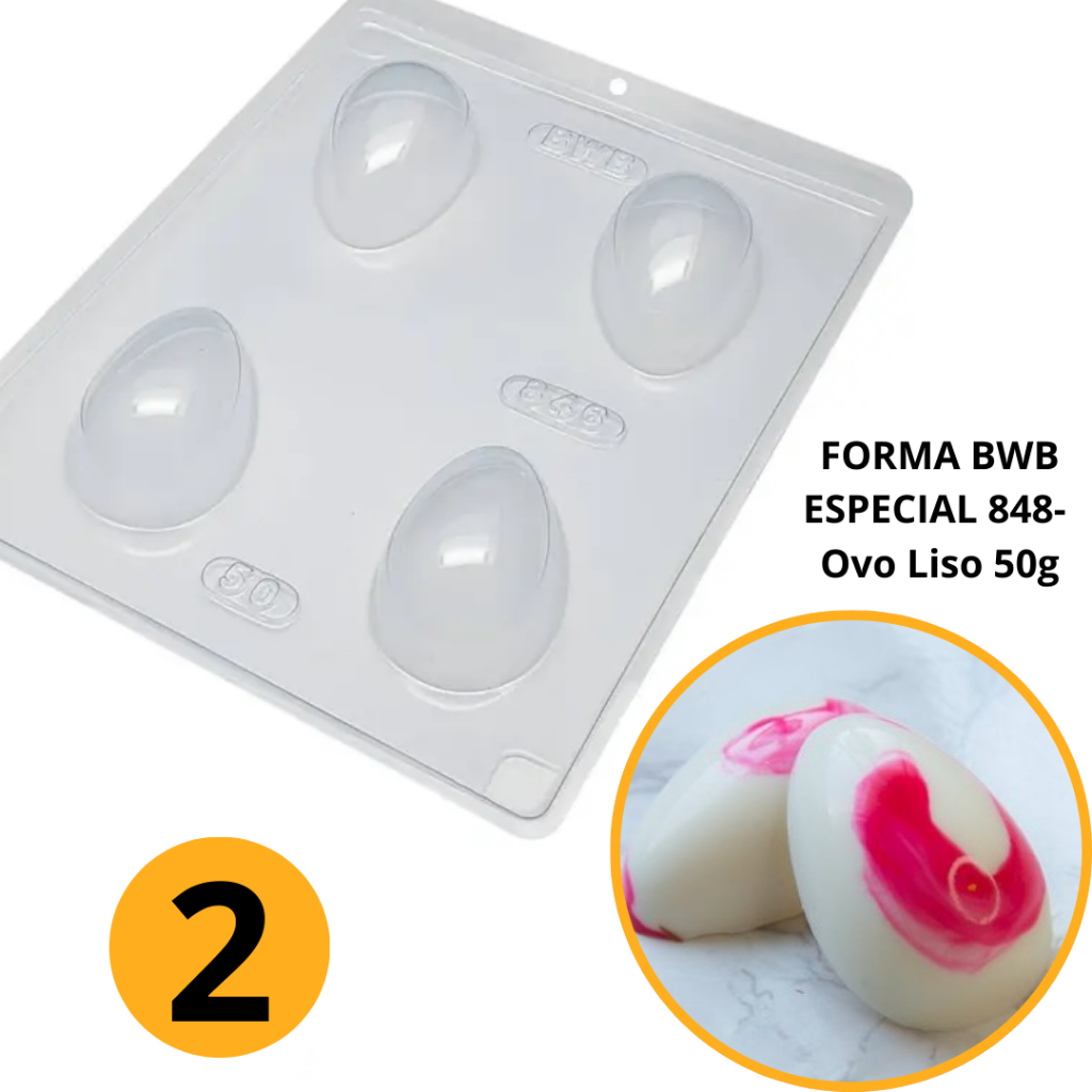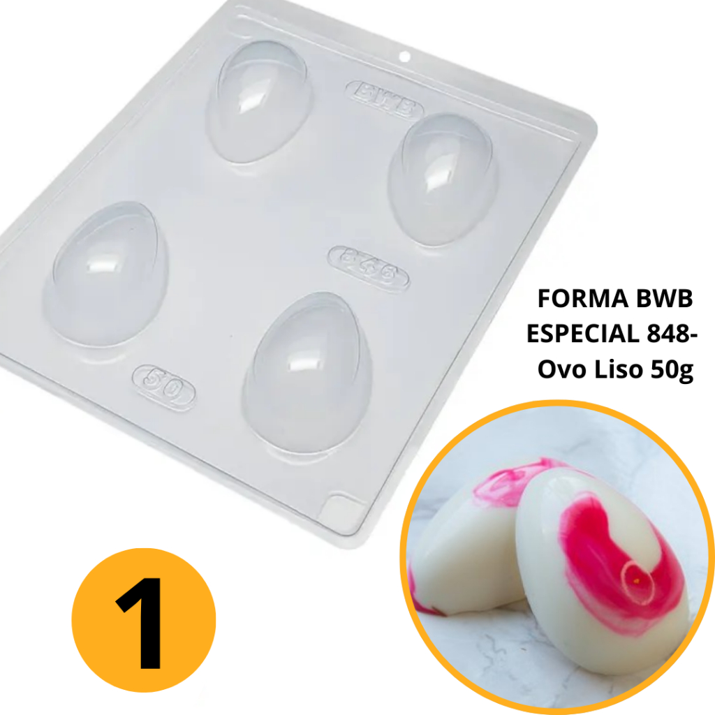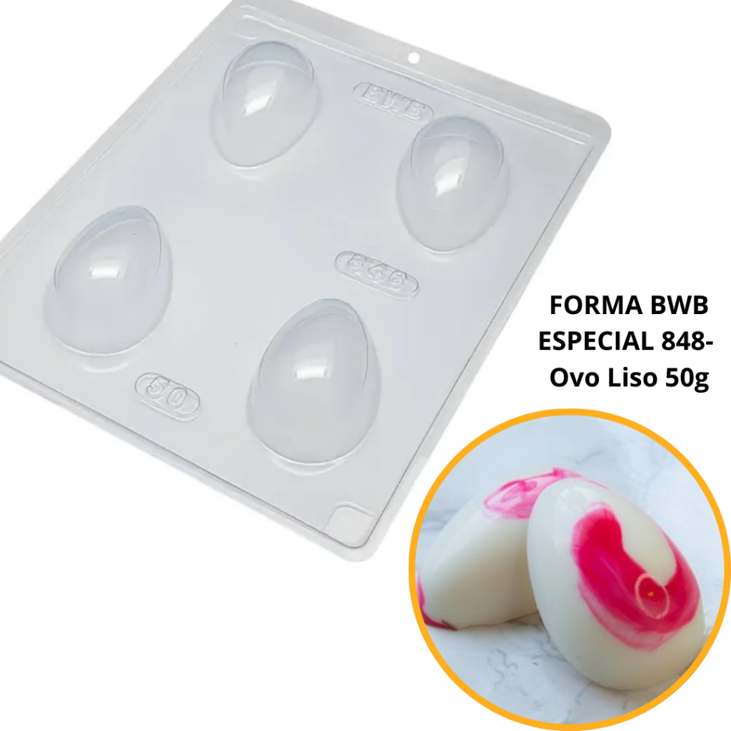 1~4 Forma BWB Com Silicone (3 partes) Para Chocolate Cód. 10467 - Ovo Liso 50g. Feliz Páscoa