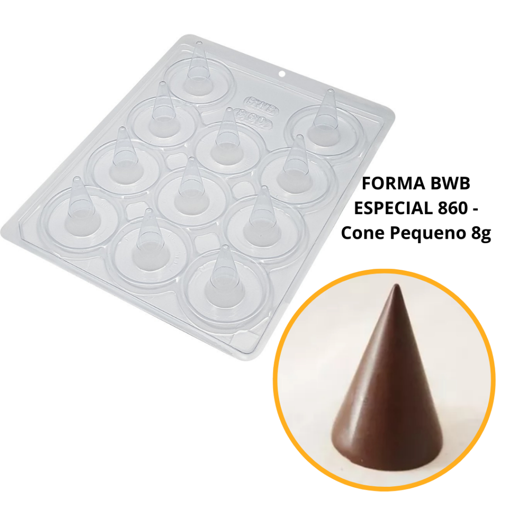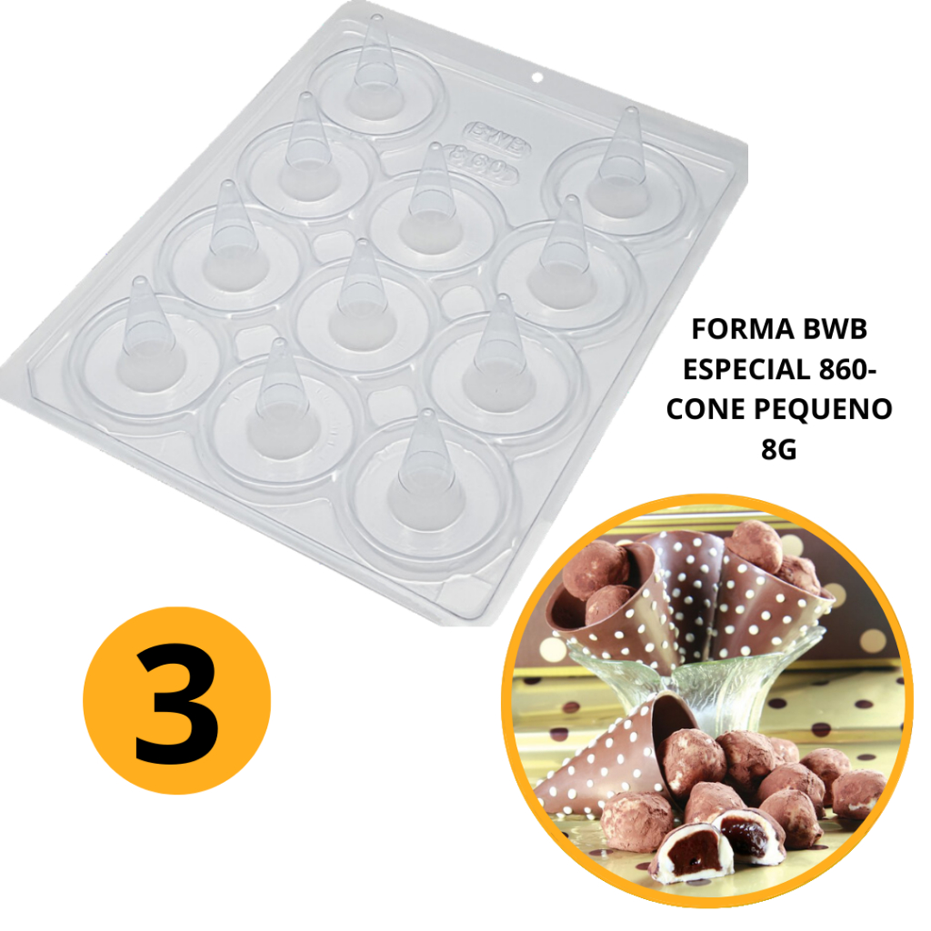 1~4 Forma BWB Com Silicone (3 partes) Para Chocolate Cód. 860 - Cone Pequeno 8g. Para Festas. Cone Trufado (CHOCO)