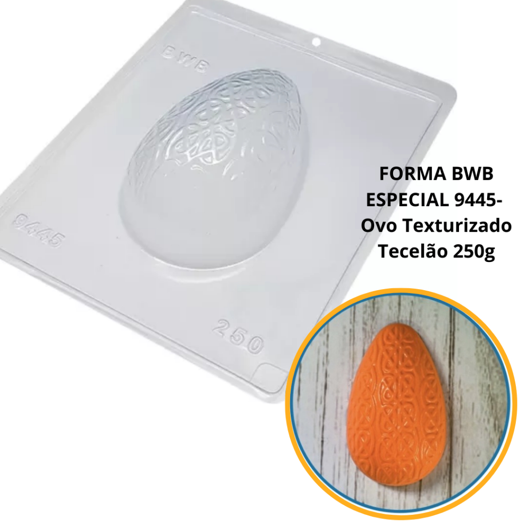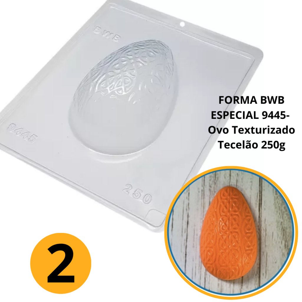 1~4 Forma BWB Com Silicone (3 partes) Para Chocolate Cód. 9445 -Ovo Texturizado Tecelão 250g. Páscoa