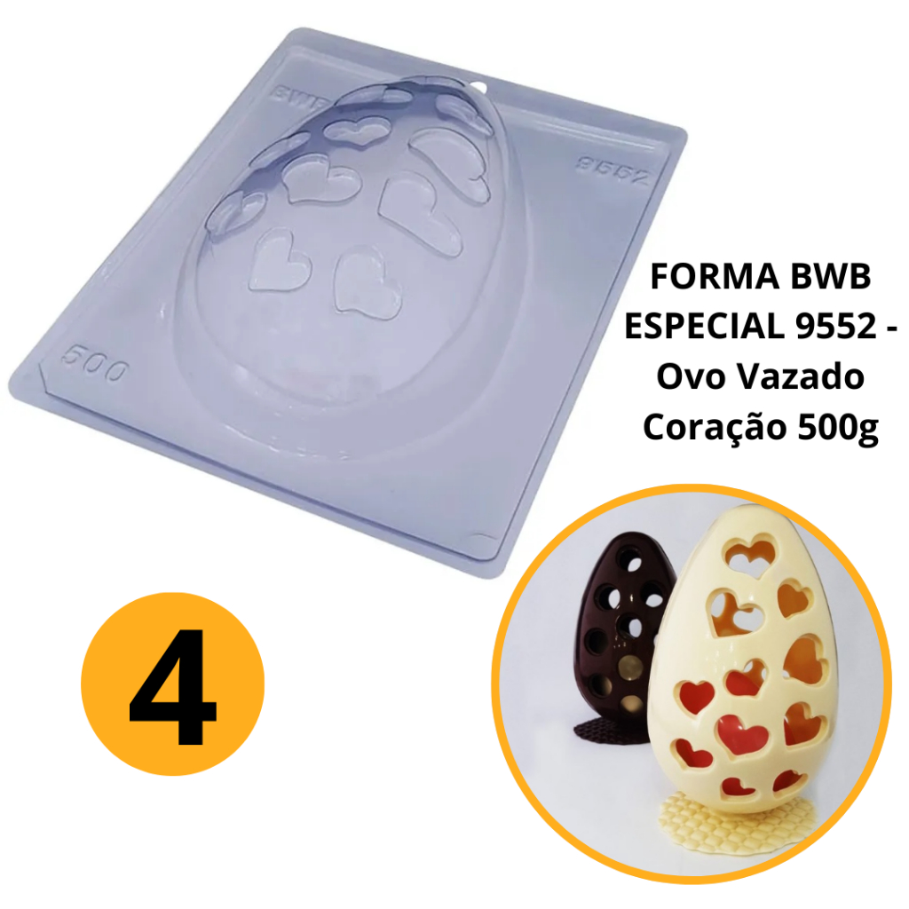 1~4 Forma BWB Com Silicone (3 partes) Para Chocolate Cód. 9552 - Ovo Vazado Coração 500g. Páscoa (CHOCO)